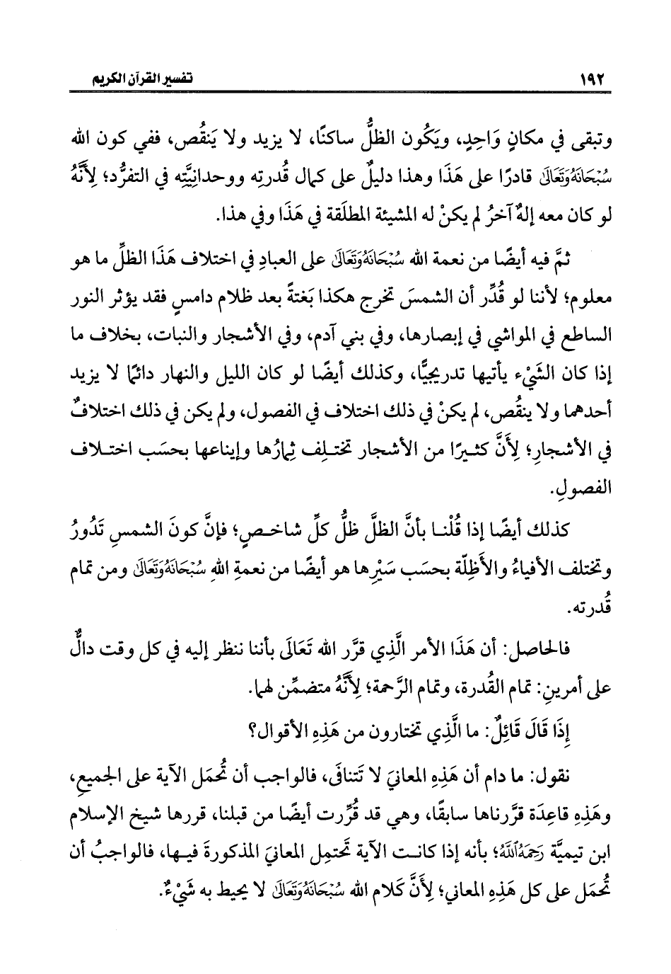 وتبقى في مكانٍ وَاحِدٍ، ويَكُون الظلُّ ساكنًا، لا يزيد ولا يَنقُص، ففي كون اللَّه سُبْحَانَهُ وَتَعَالَى قادرًا على هَذَا وهذا دليلٌ على كمال قُدرته ووحدانِيَّتِه في التفرُّد؛ لِأَنَّهُ لو كان معه إلهٌ آخرُ لم يكنْ له المشيئة المطلَقة في هَذَا وفي هذا.