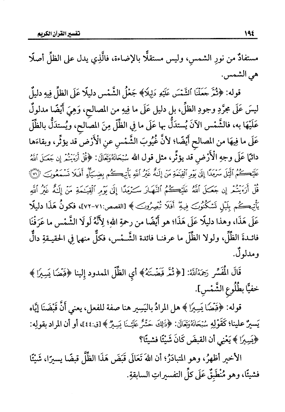 قَالَ المُفَسِّر رَحِمَهُ اللَّه: [{ثُمَّ قَبَضْنَاهُ} أي الظِّلّ الممدود إِلينا {قَبْضًا يَسِيرًا} خفيًّا بطُلُوعِ الشَّمْسِ].
