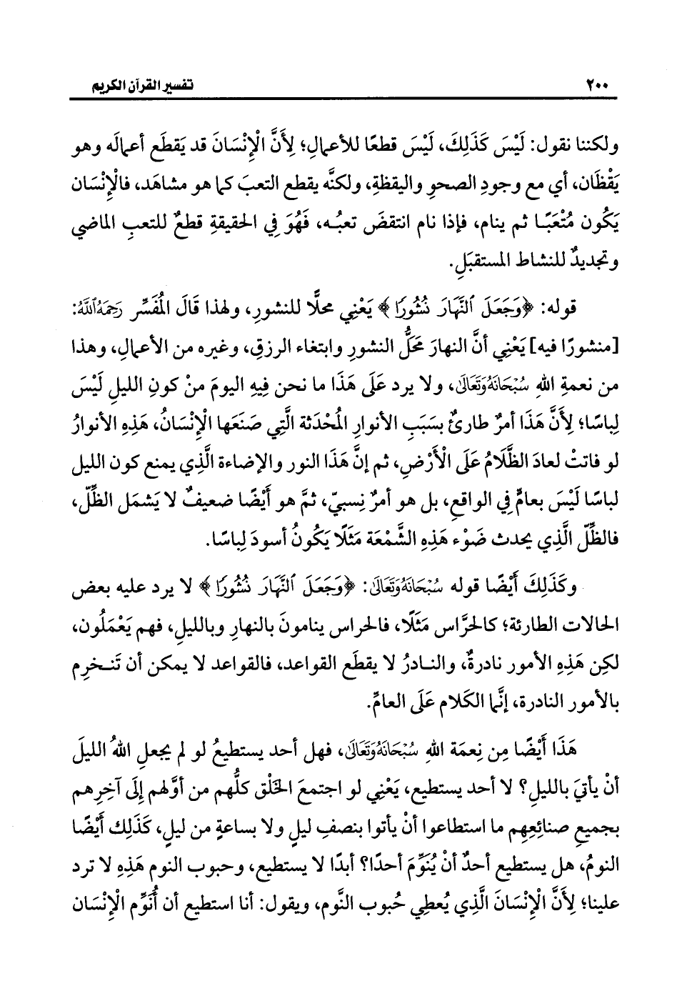 وكَذَلِكَ أيْضًا قوله سُبْحَانَهُ وَتَعَالَى: {وَجَعَلَ النَّهَارَ نُشُورًا} لا يرد عليه بعض الحالات الطارئة؛ كالحرَّاس مَثَلًا، فالحراس ينامونَ بالنهارِ وبالليلِ، فهم يَعْمَلُون، لكِن هَذِهِ الأمور نادرةٌ، والنادرُ لا يقطَع القواعد، فالقواعد لا يمكن أن تَنخرِم بالأمور النادرة، إنَّما الكَلام عَلَى العامِّ.
