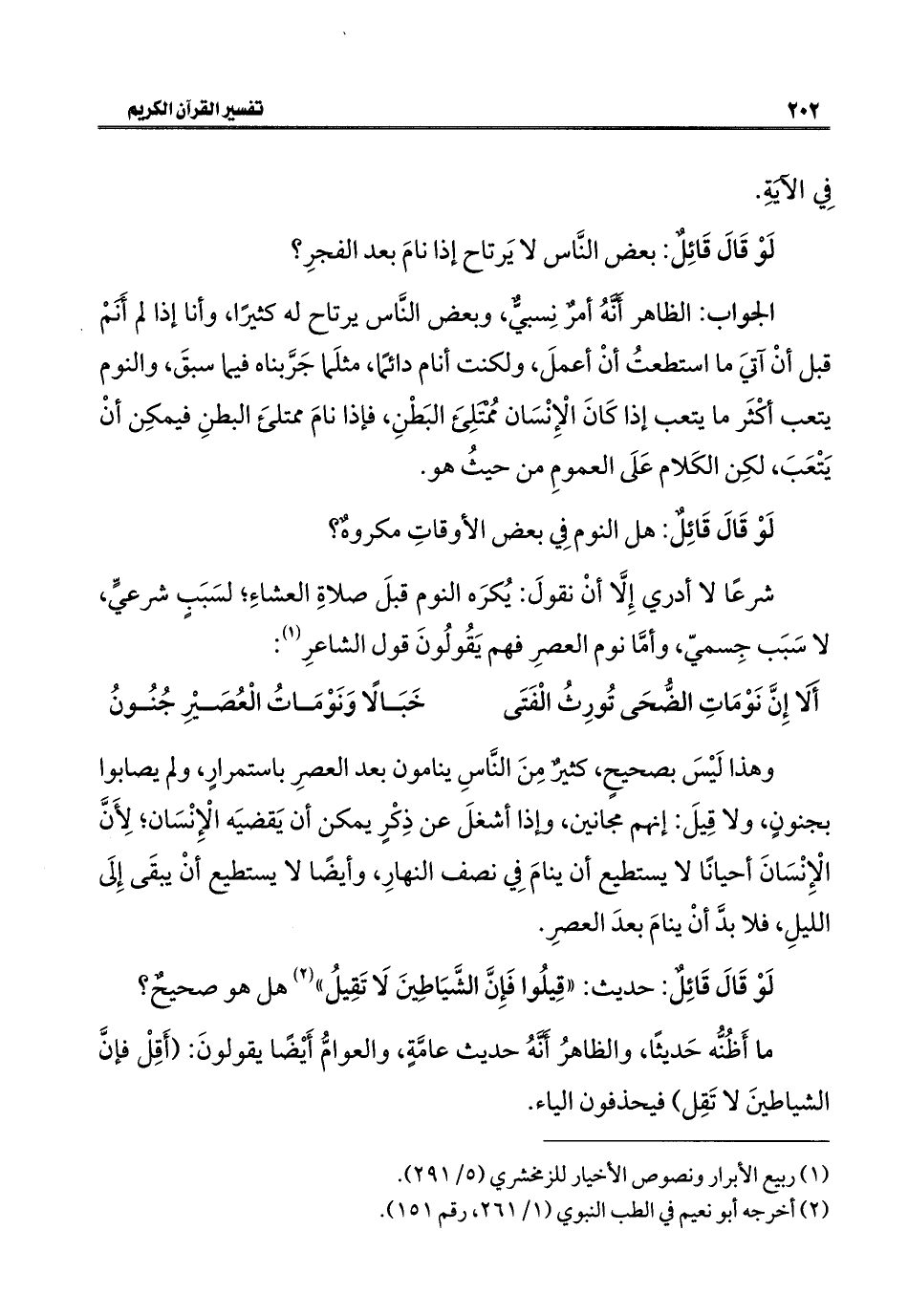 شرعًا لا أدري إِلَّا أنْ نقولَ: يُكرَه النوم قبلَ صلاةِ العشاء؛ لسَبَبٍ شرعيٍّ، لا سَبَب جِسميّ، وأمَّا نوم العصرِ فهم يَقُولُونَ قول الشاعرِ (¬١):