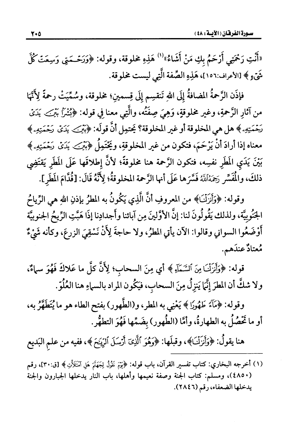 فإذَن الرَّحمةُ المضافةُ إِلَى اللَّهِ تَنقسِم إِلَى قِسمينِ؛ مخلوقة، وسُمِّيَتْ رحمةً لِأَنَّهَا من آثارِ الرَّحمةِ، وغير مخلوقةٍ، وَهِيَ صِفَتُه، والَّتِي معنا فِي قوله: {بُشْرًا بَيْنَ يَدَيْ رَحْمَتِهِ} هل هي المخلوقة أو غير المخلوقة؟ يَحتمِل أنَّ قولَه: {بَيْنَ يَدَيْ رَحْمَتِهِ} معناه إذا أرادَ أنْ يَرْحَمَ، فتكون من غير المخلوقةِ، ويَحْتَمِلُ {بَيْنَ يَدَيْ رَحْمَتِهِ} بَيْنَ يَدَي المَطَرِ نفسِه، فتكون الرَّحمة هنا مخلوقةً؛ لأنَّ إِطلاقَها عَلَى المَطَرِ يَقتَضِي ذلكَ، والمُفَسِّر رَحِمَهُ اللَّهُ فَسَّرَها عَلَى أنها الرَّحمة المخلوقةُ؛ لأَنَّهُ قَالَ: [قُدَّامَ المَطَرِ].