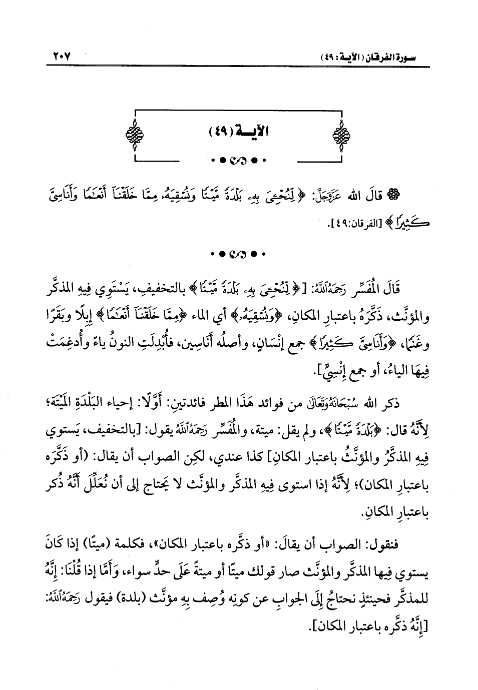 قَالَ المُفَسِّر رَحِمَهُ اللَّهُ: [{لِنُحْيِيَ بِهِ بَلْدَةً مَيْتًا} بالتخفيفِ، يَسْتَوِي فِيهِ المذكَّر والمؤنَّث، ذَكَّرَهُ باعتبارِ المكانِ، {وَنُسْقِيَهُ} أي الماء {مِمَّا خَلَقْنَا أَنْعَامًا} إِبِلًا وبَقَرًا وغَنَمًا، {وَأَنَاسِيَّ كَثِيرًا} جمع إنْسَانٍ، وأصلُه أَنَاسِين، فأُبْدِلَتِ النونُ ياءً وأُدغِمَتْ فِيهَا الياءُ، أو جمع إِنْسِيٍّ].