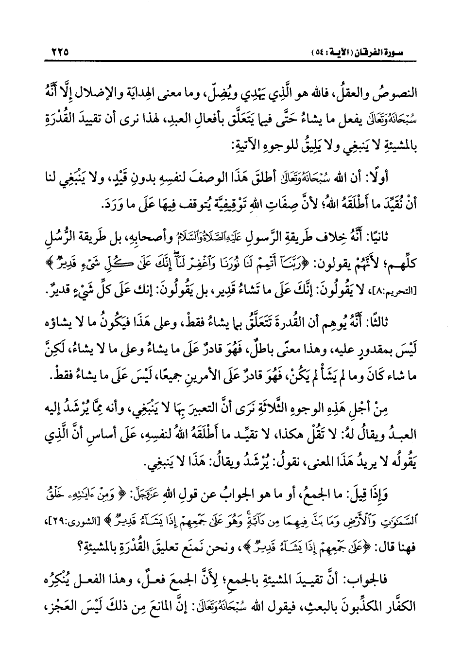 وَإِذَا قِيلَ: ما الجمعُ، أو ما هو الجوابُ عن قولِ اللَّهِ عَزَّ وَجَلَّ: {وَمِنْ آيَاتِهِ خَلْقُ السَّمَاوَاتِ وَالْأَرْضِ وَمَا بَثَّ فِيهِمَا مِنْ دَابَّةٍ وَهُوَ عَلَى جَمْعِهِمْ إِذَا يَشَاءُ قَدِيرٌ} [الشورى: ٢٩]، فهنا قال: {عَلَى جَمْعِهِمْ إِذَا يَشَاءُ قَدِيرٌ}، ونحن نَمنَع تعليقَ القُدْرَةِ بالمشيئةِ؟