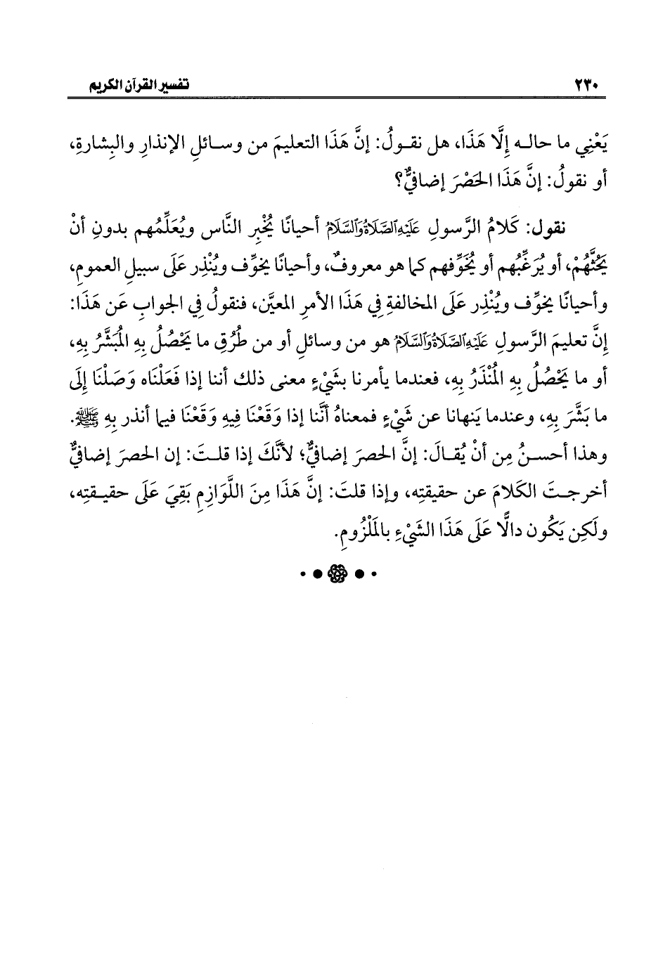 نقول: كَلامُ الرَّسولِ عَلَيْهِ الصَّلَاةُ وَالسَّلَامُ أحيانًا يُخْبِر النَّاس ويُعَلِّمُهم بدونِ أنْ يَحُثَّهُمْ، أو يُرَغِّبُهم أو يُخَوِّفهم كما هو معروفٌ، وأحيانًا يخوِّف ويُنْذِر عَلَى سبيلِ العمومِ، وأحيانًا يخوِّف ويُنْذِر عَلَى المخالفةِ فِي هَذَا الأمرِ المعيَّن، فنقولُ فِي الجوابِ عَن هَذَا: إِنَّ تعليمَ الرَّسولِ عَلَيْهِ الصَّلَاةُ وَالسَّلَامُ هو من وسائلِ أو من طُرُقِ ما يَحْصُلُ بِهِ المُبَشَّرُ بِهِ، أو ما يَحْصُلُ بِهِ المُنْذَرُ بِهِ، فعندما يأمرنا بشَيْءٍ معنى ذلك أننا إذا فَعَلْنَاه وَصَلْنَا إِلَى ما بَشَّرَ بِهِ، وعندما يَنهانا عن شَيْءٍ فمعناهُ أنَّنا إذا وَقَعْنَا فِيهِ وَقَعْنَا فيما أنذر بِهِ -صلى اللَّه عليه وسلم-. وهذا أحسنُ مِن أنْ يُقالَ: إنَّ الحصرَ إضافيٌّ؛ لأنَّكَ إذا قلتَ: إن الحصرَ إضافيٌّ أخرجتَ الكَلامَ عن حقيقتِه، وإذا قلتَ: إنَّ هَذَا مِنَ اللَّوَازِمِ بَقِيَ عَلَى حقيقتِه، ولَكِن يَكُون دالًّا عَلَى هَذَا الشَيْءِ بالمَلْزُومِ.