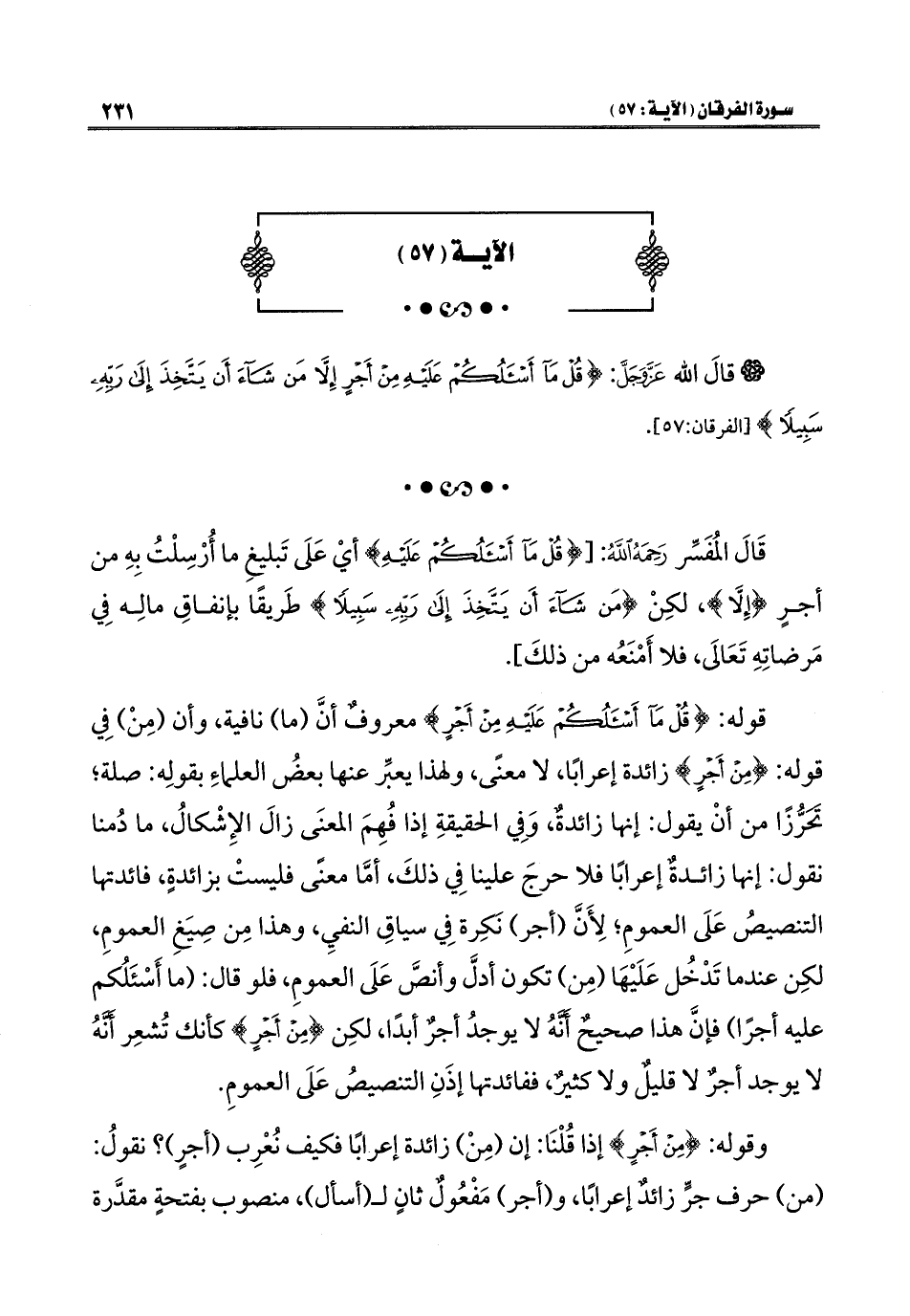 قَالَ المُفَسِّر رَحِمَهُ اللَّهُ: [{قُلْ مَا أَسْأَلُكُمْ عَلَيْهِ} أيْ عَلَى تَبليغِ ما أُرْسِلْتُ بِهِ من أجرٍ {إِلَّا}، لكِنْ {مَنْ شَاءَ أَنْ يَتَّخِذَ إِلَى رَبِّهِ سَبِيلًا} طَريقًا بإنفاقِ مالِه فِي مَرضاتِهِ تَعَالَى، فلا أَمْنَعُه من ذلكَ].