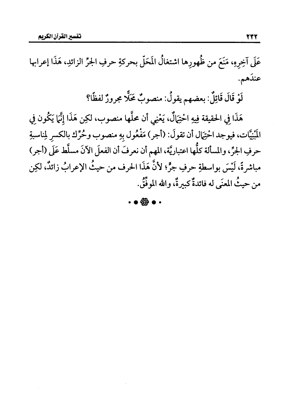 هَذَا فِي الحقيقة فِيهِ احْتِمَالٌ، يَعْنِي أن محلَّها منصوب، لكِن هَذَا إِنَّمَا يَكُون فِي المَبْنِيَّات، فيوجد احْتِمَال أن تقولَ: (أجر) مَفْعُول بِهِ منصوب وحُرِّك بالكسرِ لمِناسبةِ حرفِ الجرِّ، والمسألة كلُّها اعتبارَّية، المهم أن نعرفَ أن الفعلَ الآنَ مسلَّط عَلَى (أجر) مباشرةً، لَيْسَ بواسطةِ حرفِ جرٍّ؛ لأنَّ هَذَا الحرف من حيثُ الإعرابُ زائدٌ، لكِن من حيثُ المعنَى له فائدةٌ كبيرةٌ، واللَّه الموفِّقُ.