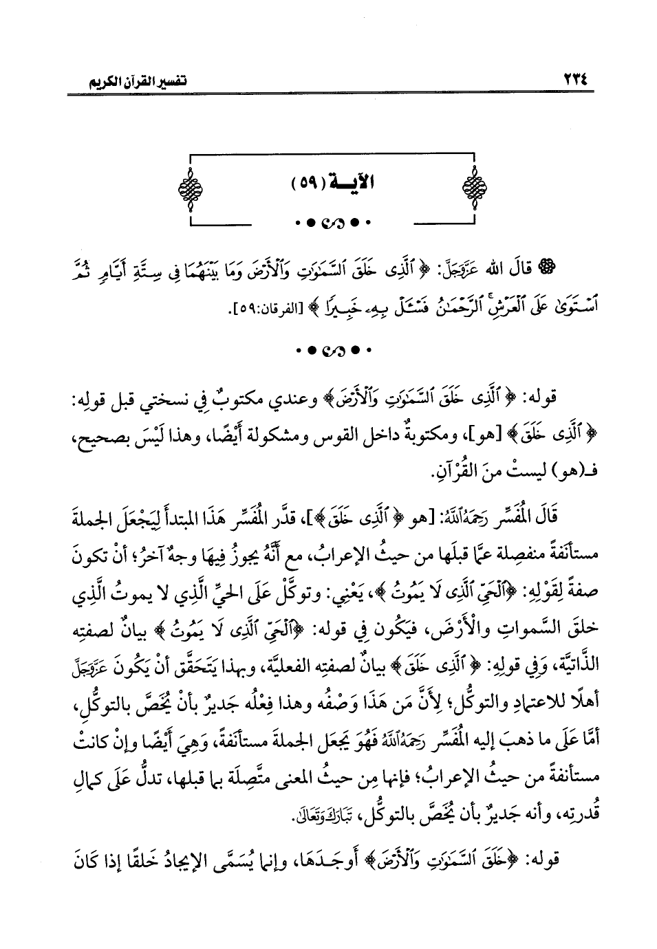 قَالَ المُفَسِّر رَحِمَهُ اللَّهُ: [هو {الَّذِي خَلَقَ}]، قدَّر المُفَسِّر هَذَا المبتدأَ ليَجْعَلَ الجملةَ مستأنَفةً منفصِلة عمَّا قبلَها من حيثُ الإعرابُ، مع أَنَّهُ يجوزُ فِيهَا وجهٌ آخرُ؛ أنْ تكونَ صفةً لِقَوْلِهِ: {الْحَيِّ الَّذِي لَا يَمُوتُ}، يَعْنِي: وتوكَّلْ عَلَى الحيِّ الَّذِي لا يموتُ الَّذِي خلقَ السَّمواتِ والْأَرْضَ، فيَكُون فِي قوله: {الْحَيِّ الَّذِي لَا يَمُوتُ} بيانٌ لصفتِه الذَّاتيَّة، وَفي قولِهِ: {الَّذِي خَلَقَ} بيانٌ لصفتِه الفعليَّة، وبهذا يَتَحَقَّق أنْ يَكُونَ عَزَّ وَجَلَّ أهلًا للاعتمادِ والتوكُّل؛ لِأَنَّ مَن هَذَا وَصْفُه وهذا فِعْلُه جَديرٌ بأنْ يُخَصَّ بالتوكُّلِ، أمَّا عَلَى ما ذهبَ إليه المُفَسِّر رَحِمَهُ اللَّهُ فَهُوَ يَجعَل الجملةَ مستأنَفةً، وَهِيَ أَيْضًا وإنْ كانتْ مستأنفةً من حيثُ الإعرابُ؛ فإنها مِن حيثُ المعنى متَّصِلَة بما قبلها، تدلُّ عَلَى كمالِ قُدرته، وأنه جَديرٌ بأن يُخَصَّ بالتوكُّل، تَبَارَكَ وَتَعَالَى.