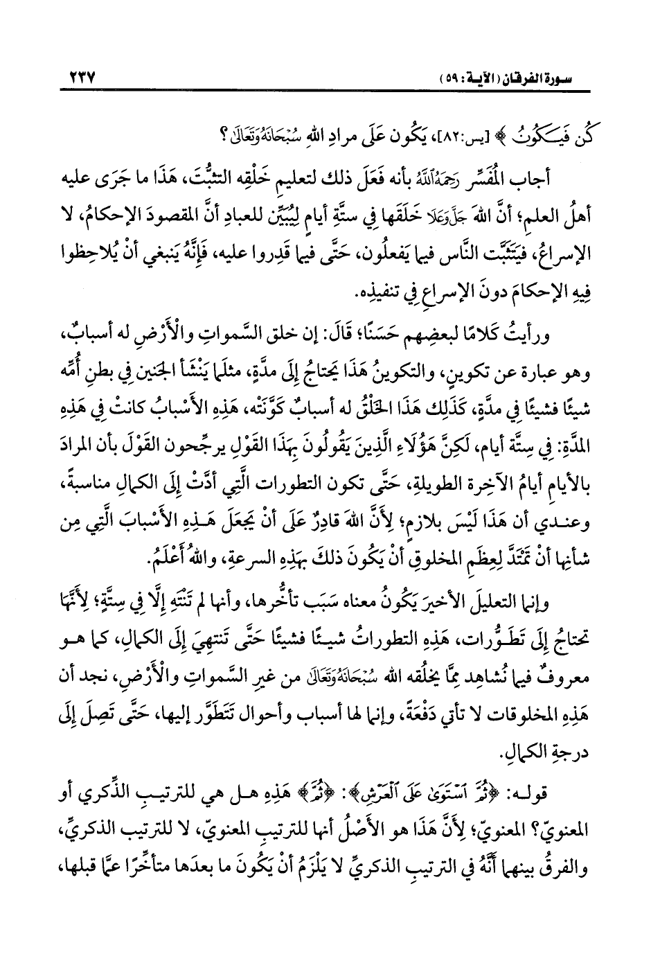ورأيتُ كَلامًا لبعضِهم حَسَنًا؛ قَالَ: إن خلق السَّمواتِ والْأَرضِ له أسبابٌ، وهو عبارة عن تكوينٍ، والتكوينُ هذَا يَحتاجُ إِلَى مدَّةٍ، مثلَما يَنْشَأ الجنين فِي بطنِ أُمِّه شيئًا فشيئًا فِي مدَّةٍ، كَذَلِك هذَا الخلْقُ له أسبابٌ كَوَّنَتْه، هذه الأَسْبابُ كانتْ فِي هَذِهِ المدَّةِ: فِي سِتَّة أيام، لَكِنَّ هؤُلَاءِ الَّذِينَ يَقُولُونَ بِهذَا القَوْلِ يرجِّحون القَوْلَ بأن المرادَ بالأيامِ أيامُ الآخِرة الطويلةِ، حَتَّى تكون التطورات الَّتِي أدَّتْ إِلَى الكمالِ مناسبةً، وعندي أن هذَا لَيْسَ بلازمٍ؛ لِأَنَّ اللَّه قادِرٌ عَلَى أنْ يَجعَلَ هذه الأَسْبابَ الَّتِي مِن شأنِها أنْ تَمتَدَّ لِعِظَمِ المخلوقِ أنْ يَكُونَ ذلكَ بهذه السرعةِ، واللَّهُ أعْلَمُ.