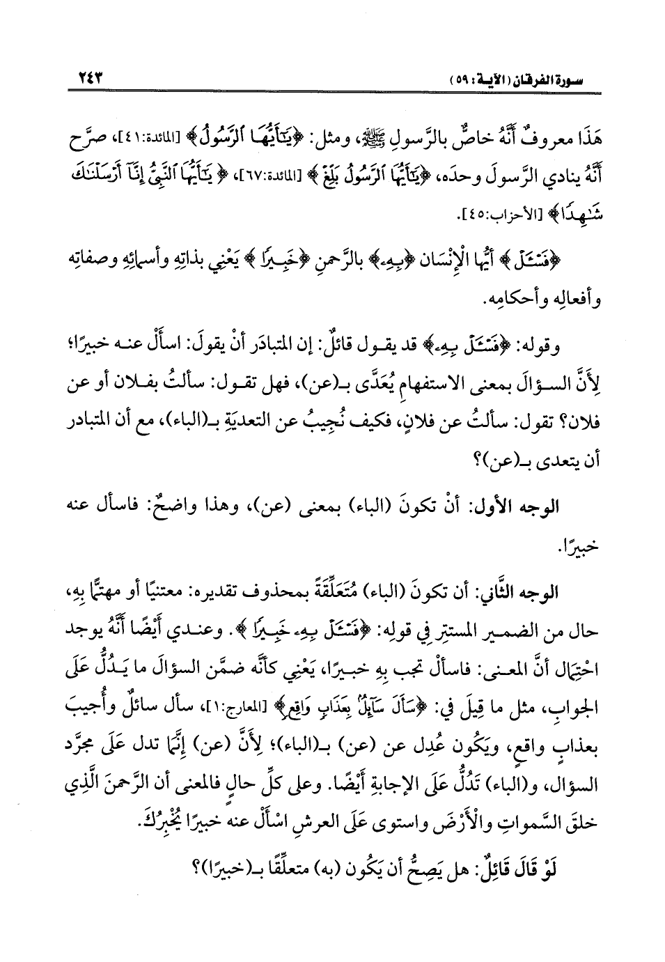 الوجه الثَّاني: أن تكونَ (الباء) مُتَعَلِّقَةً بمحذوف تقديره: معتنيًا أو مهتمًّا بِهِ، حال من الضمير المستتِر فِي قولِه: {فَاسْأَلْ بِهِ خَبِيرًا}. وعندي أَيْضًا أَنَّهُ يوجد احتِمَال أنَّ المعنى: فاسألْ تجب بِهِ خبيرًا، يَعْنِي كأَنَّه ضمَّن السؤالَ ما يَدُلُّ عَلَى الجوابِ، مثل ما قِيلَ في: {سَأَلَ سَائِلٌ بِعَذَابٍ وَاقِعٍ} [المعارج: ١]، سأل سائلٌ وأُجيبَ بعذابٍ واقعٍ، ويَكُون عُدِل عن (عن) بـ (الباء)؛ لِأَنَّ (عن) إِنَّمَا تدل عَلَى مجرَّد السؤال، و (الباء) تَدُلُّ عَلَى الإجابةِ أَيْضًا. وعلى كلِّ حالٍ فالمعنى أن الرَّحمنَ الَّذِي خلقَ السَّمواتِ والْأَرضَ واستوى عَلَى العرشِ اسْأَلْ عنه خبيرًا يُخْبِرُكَ.