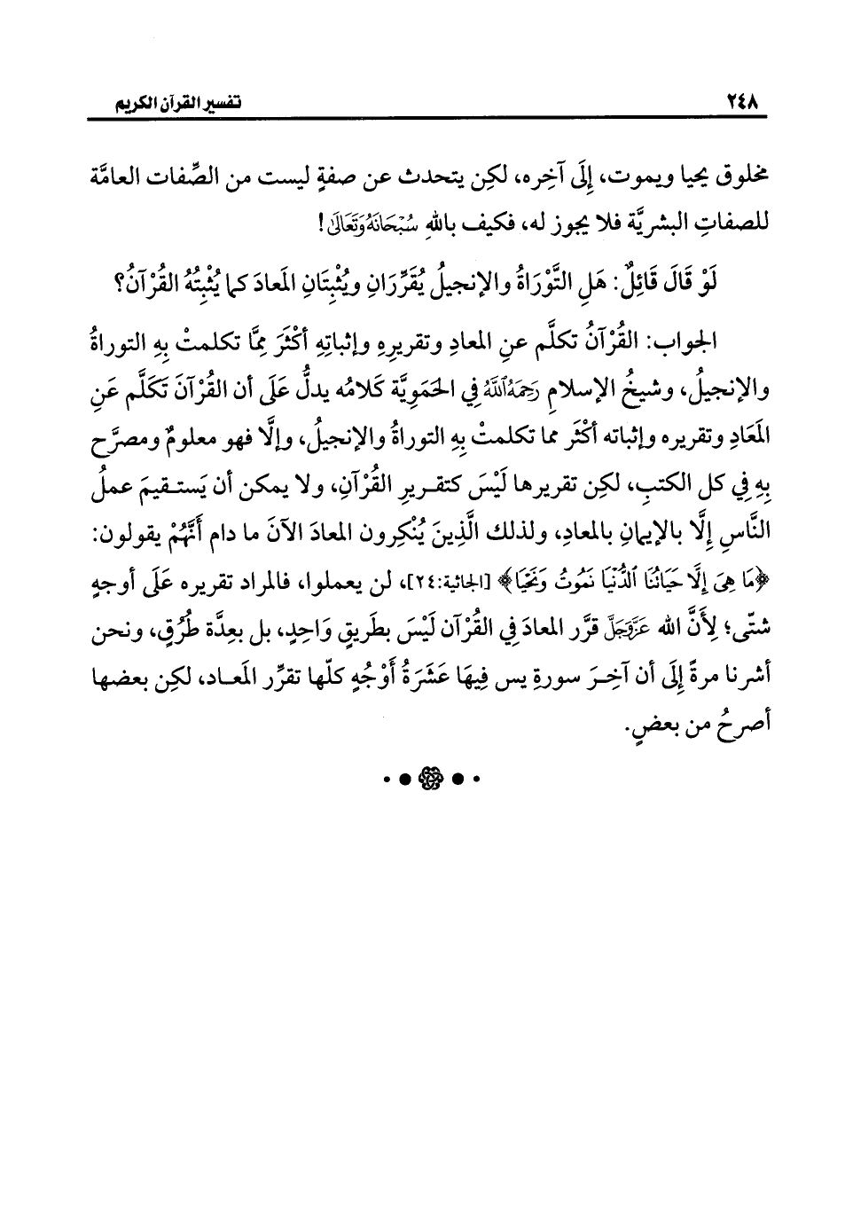 الجواب: القُرآنُ تكلَّم عنِ المعادِ وتقريرِهِ وإثباتِهِ أكْثَرَ مِمَّا تكلمتْ بِهِ التوراةُ والإنجيلُ، وشيخُ الإسلامِ رَحِمَهُ اللَّهُ فِي الحَمَوِيَّة كَلامُه يدلُّ عَلَى أن القُرآنَ تَكَلَّم عَنِ المَعَادِ وتقريره وإثباته أَكْثَر مما تكلمتْ بِهِ التوراةُ والإنجيلُ، وإلَّا فهو معلومٌ ومصرَّح بِهِ فِي كل الكتبِ، لكِن تقريرها لَيْسَ كتقريرِ القُرْآنِ، ولا يمكن أن يَستقيمَ عملُ النَّاسِ إِلَّا بالإيمانِ بالمعادِ، ولذلك الَّذِينَ يُنْكِرون المعادَ الآنَ ما دام أَنَّهُم يقولون: {مَا هِيَ إِلَّا حَيَاتُنَا الدُّنْيَا نَمُوتُ وَنَحْيَا} [الجاثية: ٢٤]، لن يعملوا، فالمراد تقريره عَلَى أوجهٍ شتّى؛ لِأَنَّ اللَّه عَزَّ وَجَلَّ قرَّر المعادَ فِي القُرْآن لَيْسَ بطَريقٍ وَاحِدٍ، بل بعِدَّة طرقٍ، ونحن أشرنا مرةً إِلَى أن آخِرَ سورة يس فِيها عَشَرَةُ أَوْجهٍ كلّها تقرِّر المَعاد، لكِن بعضها أصرحُ من بعضٍ.