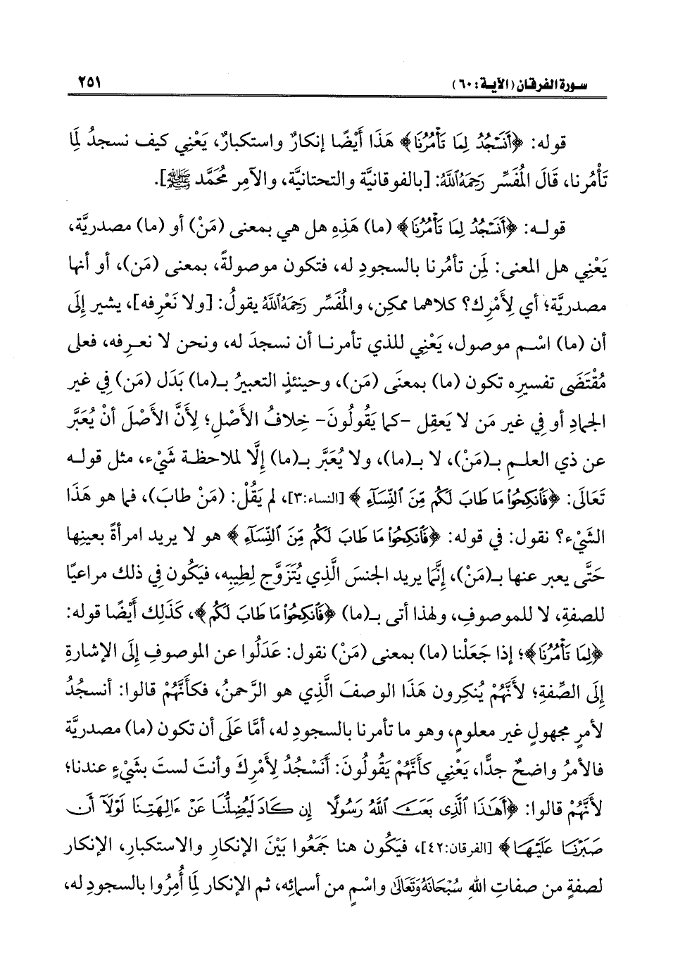 قوله: {أَنَسْجُدُ لِمَا تَأْمُرُنَا} (ما) هَذِه هل هي بمعنى (مَنْ) أو (ما) مصدريَّة، يَعْنِي هل المعنى: لمِن تأمُرنا بالسجودِ له، فتكون موصولةً، بمعنى (مَن)، أو أنها مصدريَّة؛ أي لِأَمْرِك؟ كلاهما ممكِن، والمُفَسِّر رَحِمَهُ اللَّهُ يقولُ: [ولا نَعْرِفه]، يشير إِلَى أن (ما) اسْم موصول، يَعْنِي للذي تأمرنا أن نسجدَ له، ونحن لا نعرِفه، فعلى مُقْتَضَى تفسيرِه تكون (ما) بمعنَى (مَن)، وحينئذٍ التعبيرُ بـ (ما) بَدَل (مَن) فِي غير الجمادِ أو فِي غير مَن لا يَعقِل -كما يَقُولُونَ- خِلاف الأَصْلِ؛ لِأَنَّ الأَصْلَ أنْ يُعَبَّر عن ذي العلمِ بـ (مَنْ)، لا بـ (ما)، ولا يُعَبَّر بـ (ما) إِلَّا لملاحظة شَيْء، مثل قوله تَعَالَى: {فَانْكِحُوا مَا طَابَ لَكُمْ مِنَ النِّسَاءِ} [النساء: ٣]، لم يَقُلْ: (مَنْ طابَ)، فما هو هذَا الشَيْء؟ نقول: في قوله: {فَانْكِحُوا مَا طَابَ لَكُمْ مِنَ النِّسَاءِ} هو لا يريد امرأةً بعينِها حَتَّى يعبر عنها بـ (مَنْ)، إِنَّمَا يريد الجنسَ الَّذِي يُتَزَوَّج لِطِيبِه، فيَكُون فِي ذلك مراعيًا للصفةِ، لا للموصوفِ، ولهذا أتى بـ (ما) {فَانْكِحُوا مَا طَابَ لَكُمْ}، كَذَلِك أَيْضًا قوله: {لِمَا تَأْمُرُنَا}؛ إذا جَعَلْنا (ما) بمعنى (مَنْ) نقول: عَدَلُوا عن الموصوفِ إِلَى الإشارةِ إِلَى الصِّفةِ؛ لأَنَّهُمْ يُنكِرون هذَا الوصفَ الَّذِي هو الرَّحمنُ، فكأَنَّهُمْ قالوا: أنسجُدُ لأمرٍ مجهولٍ غير معلومٍ، وهو ما تأمرنا بالسجودِ له، أمَّا عَلَى أن تكون (ما) مصدريَّة فالأمرُ واضحٌ جدًّا، يَعنِي كأَنَّهُمْ يَقُولُونَ: أَنَسْجُدُ لِأَمرِكَ وأنتَ لستَ بشَيْءٍ عندنا؛ لأَنَّهُمْ قالوا: {أَهَذَا الَّذِي بَعَثَ اللَّهُ رَسُولًا (٤١) إِنْ كَادَ لَيُضِلُّنَا عَنْ آلِهَتِنَا لَوْلَا أَنْ صَبَرْنَا عَلَيْهَا} [الفرقان: ٤١ - ٤٢]، فيَكُون هنا جَمَعُوا بَيْنَ الإنكارِ والاستكبارِ، الإنكار لصفةٍ من صفاتِ اللَّهِ سُبْحَانَهُ وَتَعَالَى واسْمٍ من أسمائِه، ثم الإنكار لِمَا أُمِرُوا بالسجودِ له،