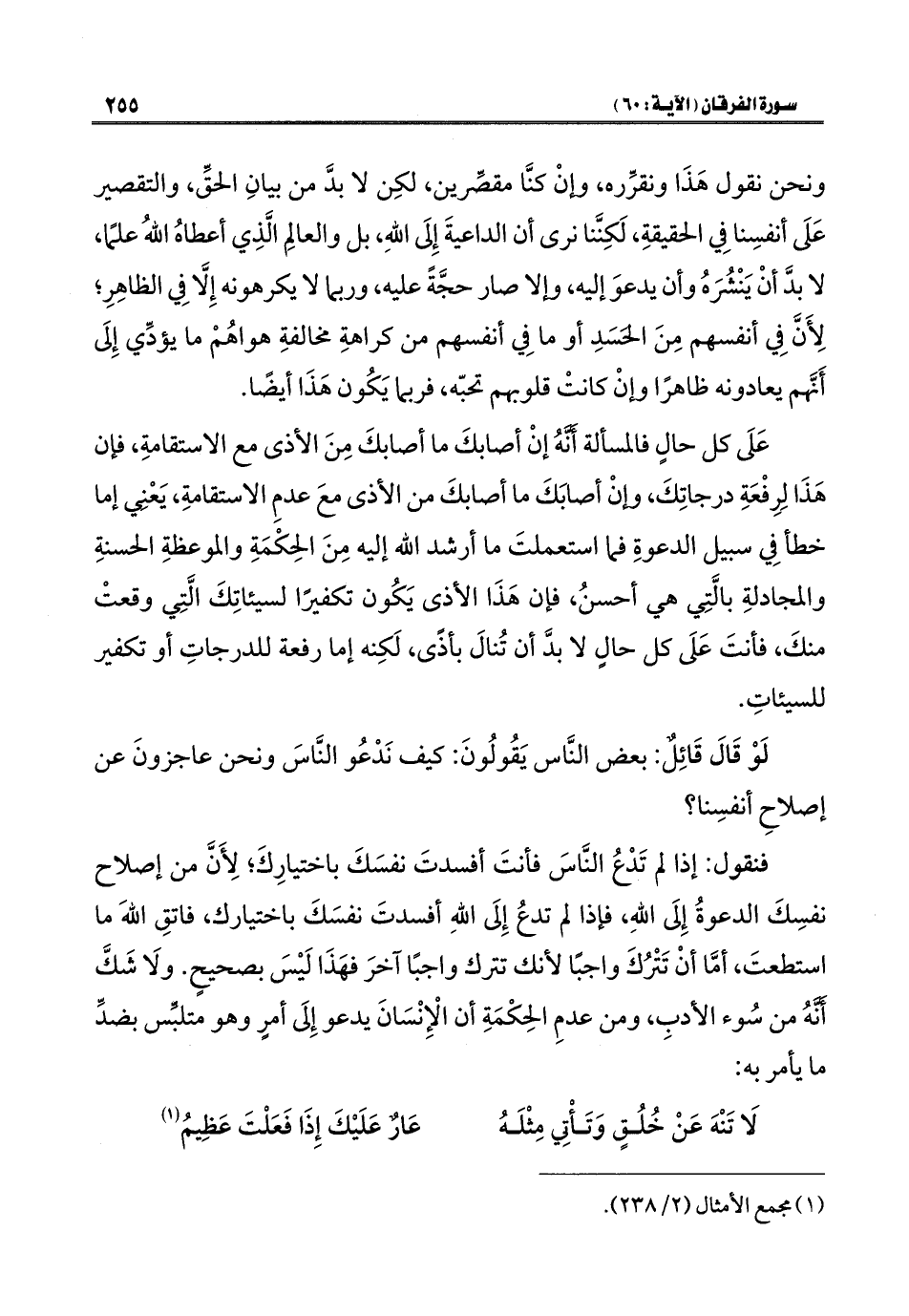 فنقول: إذا لم تَدْعُ النَّاسَ فأنتَ أفسدتَ نفسَكَ باختيارِكَ؛ لِأَنَّ من إصلاح نفسِكَ الدعوةُ إِلَى اللَّهِ، فإذا لم تدعُ إِلَى اللَّهِ أفسدتَ نفسَكَ باختيارك، فاتقِ اللَّهَ ما استطعتَ، أمَّا أنْ تَتْرُكَ واجبًا لأنك تترك واجبًا آخرَ فهَذَا لَيْسَ بصحيحٍ. ولَا شَكَّ أَنَّهُ من سُوء الأدبِ، ومن عدمِ الحِكْمَةِ أن الْإِنْسَانَ يدعو إِلَى أمرٍ وهو متلبِّس بضدِّ ما يأمر به: