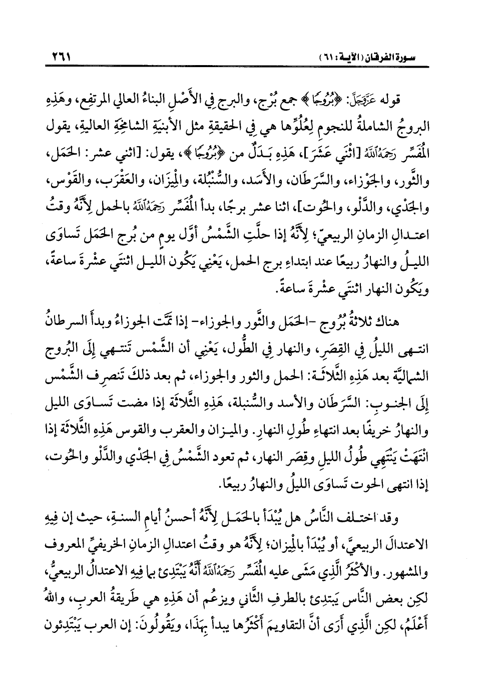 قوله عَزَّ وَجَلَّ: {بُرُوجًا} جمع بُرْج، والبرج فِي الأَصْلِ البناءُ العالي المرتفِع، وهَذِهِ البروجُ الشاملةُ للنجومِ لِعُلُوِّها هي فِي الحقيقةِ مثل الأبنيَةِ الشامِخَةِ العاليةِ، يقول المُفَسِّر رَحِمَهُ اللَّهُ [اثْنَي عَشَرَ]، هَذِهِ بَدَلٌ من {بُرُوجًا}، يقول: [اثني عشر: الحَمَل، والثَّور، والجَوْزاء، والسَّرَطَان، والأَسَد، والسُّنْبُلة، والميزَان، والعَقْرَب، والقَوْس، والجَدْي، والدَّلْو، والحُوت] اثنا عشر برجًا، بدأ المُفَسِّر رَحِمَهُ اللَّهُ بالحمل لِأَنَّهُ وقتُ اعتدالِ الزمانِ الربيعيّ؛ لِأَنَّهُ إذا حلَّتِ الشَّمْسُ أوَّل يومٍ من بُرج الحَمَل تَساوَى الليلُ والنهارُ ربيعًا عند ابتداءِ برج الحمل، يَعْنِي يَكُون الليل اثنتَي عشْرةَ ساعةً، ويَكُون النهار اثنتَي عشْرةَ ساعةً.