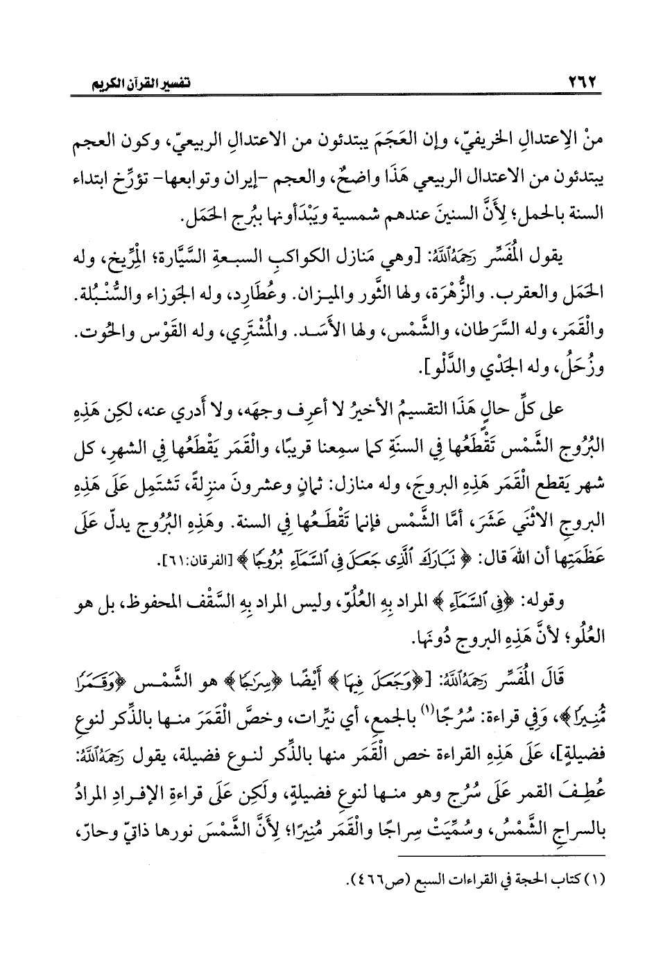 قَالَ المُفَسِّر رَحِمَهُ اللَّهُ: [{وَجَعَلَ فِيهَا} أَيْضًا {سِرَاجًا} هو الشَّمْس {وَقَمَرًا مُنِيرًا}، وَفِي قراءة: سُرُجًا (¬١) بالجمعِ، أي نيِّرات، وخصَّ الْقَمَرَ منها بالذِّكر لنوعِ فضيلةٍ]، عَلَى هَذِهِ القراءة خص الْقَمَر منها بالذِّكر لنوع فضيلة، يقول رَحِمَهُ اللَّهُ: عُطِفَ القمر عَلَى سُرُج وهو منها لنوعِ فضيلةٍ، ولَكِن عَلَى قراءةِ الإفرادِ المرادُ بالسراجِ الشَّمْسُ، وسُمِّيَتْ سِراجًا والْقَمَر مُنِيرًا؛ لِأَنَّ الشَّمْسَ نورها ذاتيّ وحارّ،