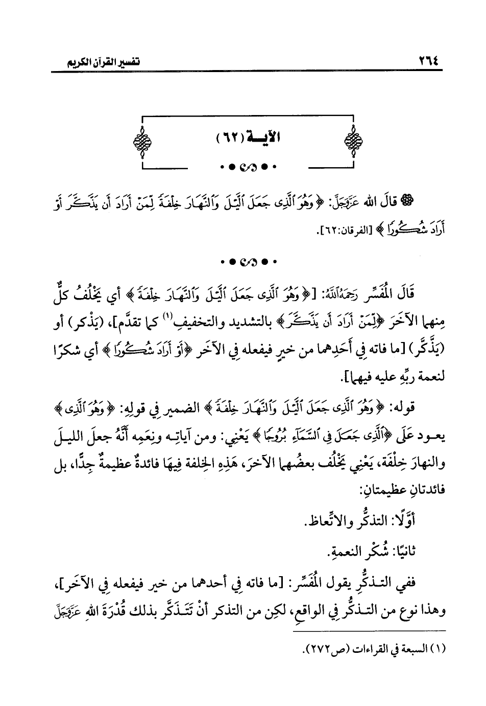 قَالَ المُفَسِّر رَحِمَهُ اللَّهُ: [{وَهُوَ الَّذِي جَعَلَ اللَّيْلَ وَالنَّهَارَ خِلْفَةً} أي يَخْلُفُ كلٌّ مِنهما الآخَرَ {لِمَنْ أَرَادَ أَنْ يَذَّكَّرَ} بالتشديد والتخفيفِ (¬١) كما تقدَّم]، (يَذْكر) أو (يَذَّكَّر) [ما فاته فِي أَحَدِهما من خيرٍ فيفعله فِي الآخَر {أَوْ أَرَادَ شُكُورًا} أي شكرًا لنعمة ربِّهِ عليه فيهما].