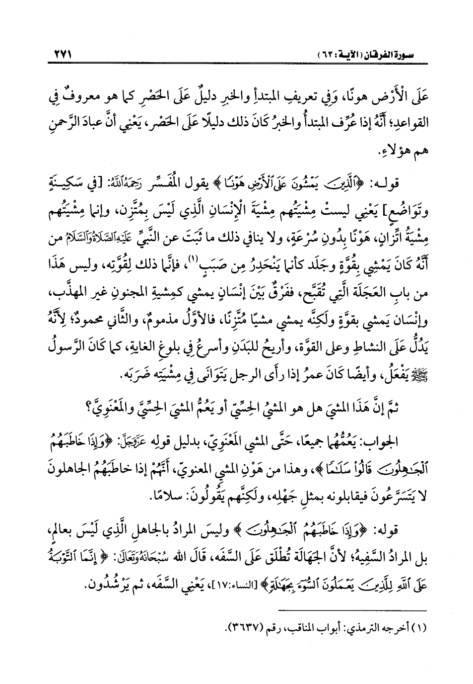 قوله: {الَّذِينَ يَمْشُونَ عَلَى الْأَرْضِ هَوْنًا} قول المُفَسِّر رَحِمَهُ اللَّهُ: [في سَكِينَةٍ وتَوَاضُعٍ، يَعْنِي ليستْ مِشْيَتُهم مِشْيَةَ الْإِنْسَانِ الَّذِي لَيْسَ بِمُتَّزِن، وإنَّما مِشْيَتُهم مِشْيَةُ اتِّزانٍ، هَوْنًا بِدُونِ سُرْعَةٍ، ولا ينافي ذلك ما ثَبَتَ عن النَّبيِّ عَلَيْهِ الصَّلَاةُ وَالسَّلَامُ من أَنَّهُ كَانَ يَمْشِي بِقُوَّةٍ وجَلَد كأنَّما يَنْحَدِرُ مِن صَبَبٍ (¬١)، فإنَّما ذلك لِقُوَّتِه، وليس هَذَا من بابِ العَجَلَة الَّتِي تُقَبَّح، ففَرَّقٌ بَيْنَ إنْسَانٍ يمشي كمِشيةِ المجنونِ غير المهذَّب، وإنْسَان يَمْشِي بقوَّةٍ ولَكِنَّه يمْشِي مشيًا مُتَّزِنًا، فالأوَّلُ مذمومٌ، والثَّاني محمودٌ؛ لِأَنَّهُ يَدُلُّ عَلَى النشاطِ وعلى القوَّة، وأريحُ للبَدَنِ وأسرعُ فِي بلوغِ الغايةِ، كما كَانَ الرَّسولُ -صلى اللَّه عليه وسلم- يَفْعَلُ، وأيضًا كَانَ عمرُ إذا رأَى الرجل يَتَوَانَى فِي مِشْيَتِهِ ضَرَبَه.