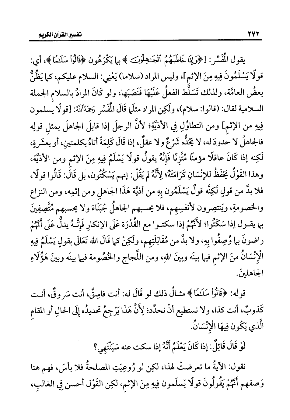 يقول المُفَسِّر: [{وَإِذَا خَاطَبَهُمُ الْجَاهِلُونَ} بما يَكْرَهُون {قَالُوا سَلَامًا}، أي: قولًا يَسْلَمُونَ فِيهِ مِنَ الإثمِ] وليس المراد (سلاما) يَعْنِي: السلام عليكم، كما يَظُنُّ بعضُ العامَّة، ولذلك تَسَلَّط الفعلُ عَلَيْهَا فَنَصَبَها، ولو كَانَ المرادُ بالسلامِ الجملة السلامية لقال: (قالوا: سلام)، ولَكِن المراد مثلَما قَالَ المُفَسِّر رَحِمَهُ اللَّهُ: [قولًا يسلمون فِيهِ من الإثمِ] ومن التطاوُلِ فِي الأذيَّةِ؛ لأنَّ الرجلَ إذا قابلَ الجاهلَ بمثلِ قولِه فالجاهلُ لا حدودَ له، لا يَحُدُّه شَرْعٌ ولا عقلٌ، إذا قَالَ كَلِمَةً أتاهُ بكلمتينِ، أو بعشَرةٍ، لَكِنه إذا كَانَ عاقلًا مؤمنًا مُتَّزِنًا فَإِنَّهُ يقولُ قولًا يَسْلَمُ فِيهِ مِنَ الإثمِ ومن الأذيَّة، وهذا القَوْلُ يَحْفَظُ للإنْسَانِ كَرَامَتَهُ؛ لِأَنَّهُ لم يَقُلْ: إنهم يَسْكُتُون، بل قَالَ: قَالُوا قولًا، فلا بدَّ من قولٍ لَكِنَّه قولٌ يَسْلَمُون بِهِ من أذيَّة هَذَا الجاهلِ ومن إثمِه، ومن النزاع والخصومةِ، ويَنتصِرون لأنفسِهِم، فلا يحسبهم الجاهلُ جُبَنَاءَ ولا يحسبهم مُتَّصِفِينَ بما يقول إذا سَكَتُوا؛ لأَنَّهُمْ إذا سكتوا مع القُدْرَة عَلَى الإنكارِ فَإِنَّهُ يدلُّ عَلَى أَنَّهُمْ راضونَ بما وُصِفُوا بِهِ، ولا بدَّ من مُقَابَلَتِهِم، ولَكِنْ كما قَالَ اللَّه تَعَالَى بقولٍ يَسْلَمُ فِيهِ الْإِنْسَانُ منَ الإثمِ فيما بينَه وبينَ اللَّهِ، ومن اللَّجاج والخُصُومة فيما بينَه وبينَ هَؤُلَاءِ الجاهلينَ.