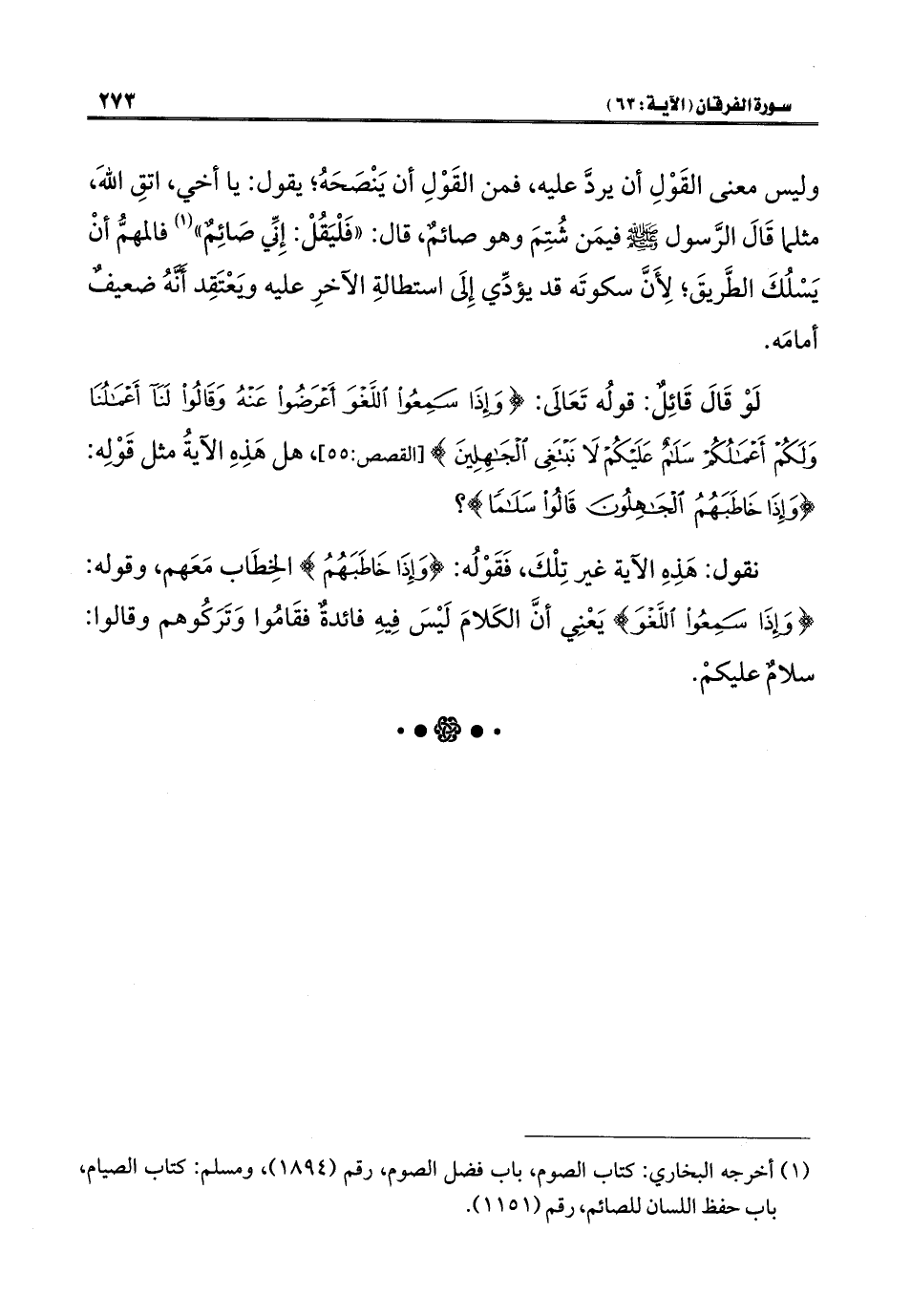 وليس معنى القَوْلِ أن يردَّ عليه، فمن القَوْلِ أن يَنْصَحَهُ؛ يقول: يا أخي، اتقِ اللَّهَ، مثلما قَالَ الرَّسول -صلى اللَّه عليه وسلم- فيمَن شُتِمَ وهو صائمٌ، قال: "فَلْيَقُلْ: إِنِّي صَائِمٌ" (¬١) فالمهمُّ أنْ يَسْلُكَ الطَّريقَ؛ لِأَنَّ سكوتَه قد يؤدِّي إِلَى استطالةِ الآخرِ عليه ويَعْتَقِد أَنَّهُ ضعيفٌ أمامَه.