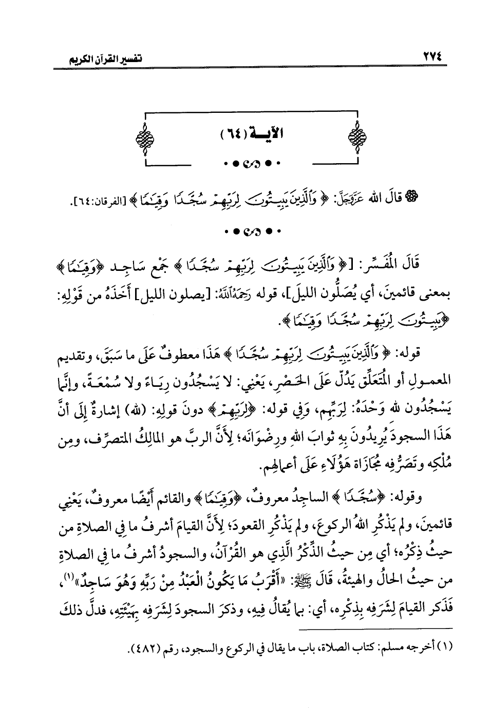 قَالَ المُفَسِّر: [{وَالَّذِينَ يَبِيتُونَ لِرَبِّهِمْ سُجَّدًا} جَمْع سَاجِد {وَقِيَامًا} بمعنى قائمينَ، أي يُصَلُّون الليلَ]، قوله رَحِمَهُ اللَّهُ: [يصلون الليل] أَخَذَهُ من قَوْلِهِ: {يَبِيتُونَ لِرَبِّهِمْ سُجَّدًا وَقِيَامًا}.