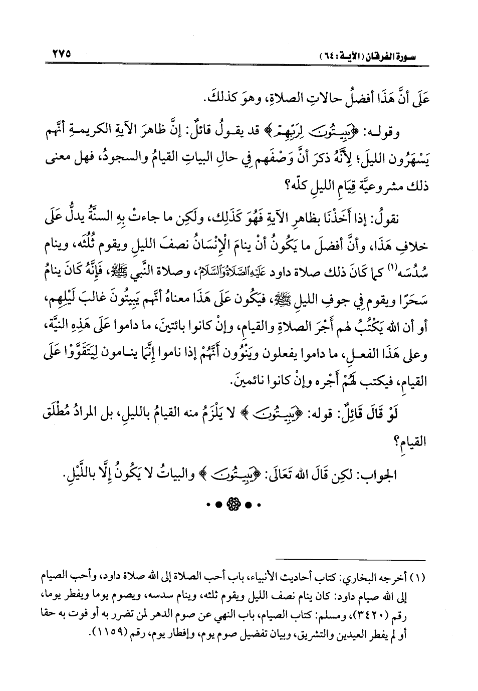 نقولُ: إذا أَخَذْنَا بظاهرِ الآيةِ فَهُوَ كَذَلِك، ولَكِن ما جاءتْ بِهِ السنَّةُ يدلُّ عَلَى خلافِ هَذَا، وأنَّ أفضلَ ما يَكُونُ أنْ ينامَ الْإِنْسَانُ نصفَ الليلِ ويقوم ثُلُثَه، وينام سُدُسَه (¬١) كما كَانَ ذلك صلاة داود عَلَيْهِ الصَّلَاةُ وَالسَّلَامُ، وصلاة النَّبي -صلى اللَّه عليه وسلم-، فَإِنَّهُ كَانَ ينامُ سَحَرًا ويقوم فِي جوفِ الليلِ -صلى اللَّه عليه وسلم-، فيَكُون عَلَى هَذَا معناهُ أنَّهم يَبِيتُونَ غالبَ لَيْلِهِم، أو أن اللَّه يَكْتُبُ لهم أَجْرَ الصلاةِ والقيامِ، وإنْ كانوا بائتينَ، ما داموا عَلَى هَذِهِ النيَّة، وعلى هَذَا الفعلِ، ما داموا يفعلون ويَنْوُون أَنَّهُمْ إذا ناموا إِنَّمَا ينامون لِيَتَقَوَّوْا عَلَى القيامِ، فيكتب لَهُمْ أَجْره وإنْ كانوا نائمينَ.