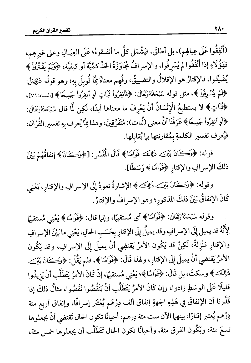 (أَنْفِقُوا عَلَى عِيالهِم)، بل أطلقَ، فيَشْمَل كلَّ ما أنفقوهُ، عَلَى العِيَالِ وعلى غيرِهِم، فهَؤُلَاءِ إذا أَنْفَقُوا لم يُسْرِفُوا، والإسرافُ مُجَاوَزَةُ الحَدِّ كمِّيَّة أو كيفيَّة، {وَلَمْ يَقْتُرُوا} يُضَيِّقوا، فالإقتارُ هو الإقلالُ والتضييقُ، وفُهِم معناهُ مِمَّا قُوبِلَ بِهِ، وهو قولُه عَزَّ وَجَلَّ: {لَمْ يُسْرِفُوا}، مثل قوله سُبْحَانَهُ وَتَعَالَى: {فَانْفِرُوا ثُبَاتٍ أَوِ انْفِرُوا جَمِيعًا} [النساء: ٧١]، {ثُبَاتٍ} لا يستطيعُ الْإِنْسَانُ أنْ يَعْرِفَ ما معناها أبدًا، لَكِن لمَّا قال سُبْحَانَهُ وَتَعَالَى: {انفِرُوا جَمِيعًا} عَرَفْنَا أنَّ معنى (ثُبات): مُتَفَرِّقِينَ، وهذا مِمَّا يُعرف بِهِ تفسير القُرْآن، فيُعرف تفسير الكلمةِ بِمُقارنتها بما يُقابِلها.