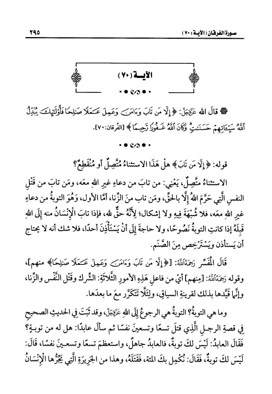 قَالَ المُفَسِّر رَحِمَهُ اللَّهُ: [{إِلَّا مَنْ تَابَ وَآمَنَ وَعَمِلَ عَمَلًا صَالِحًا} منهم]، وقوله رَحِمَهُ اللَّهُ: [مِنهم] أيْ من فاعلِ هَذِهِ الأمورِ الثَّلاثَةِ: الشِّرك وقَتْل النَّفْس والزِّنا، وإنَّما قَيَّدها بذلك لقرينةِ السياقِ، ولِئَلَّا تَتكَرَّر معَ ما بعدَها.