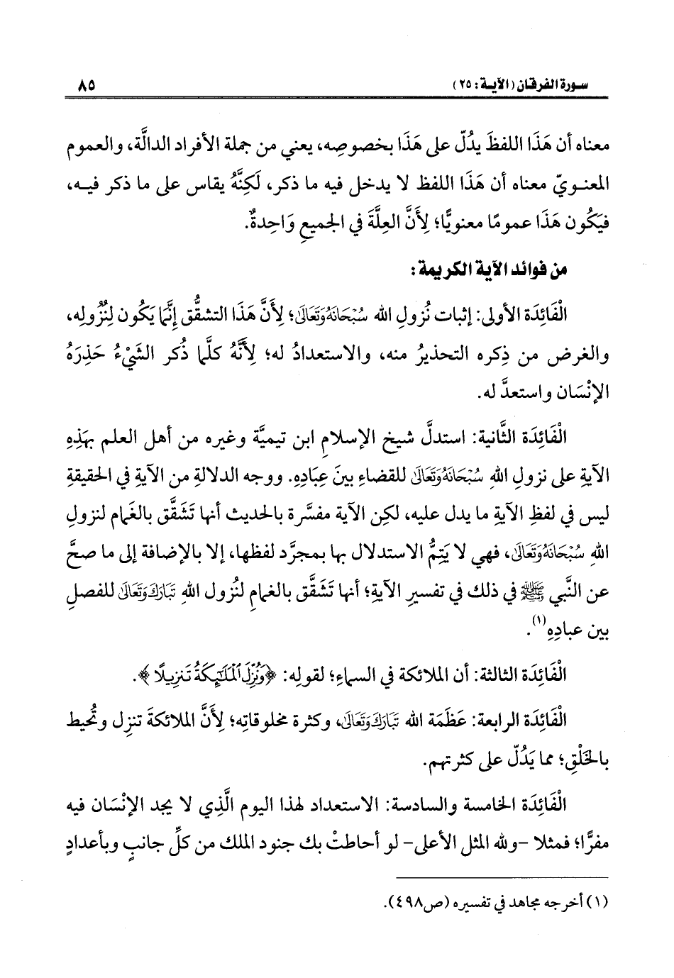 الْفَائِدَة الثَّانية: استدلَّ شيخ الإسلامِ ابن تيميَّة وغيره من أهل العلم بهَذِهِ الآية على نزولِ اللَّهِ سُبْحَانَهُ وَتَعَالَى للقضاءِ بينَ عِبَادِهِ. ووجه الدلالةِ من الآيةِ في الحقيقةِ ليس في لفظِ الآيةِ ما يدل عليه، لكِن الآية مفسَّرة بالحديث أنها تَشَقَّق بالغَمام لنزولِ اللَّهِ سُبْحَانَهُ وَتَعَالَى، فهي لا يَتمُّ الاستدلال بها بمجرَّد لفظها، إلا بالإضافة إلى ما صحَّ عن النَّبي -صلى اللَّه عليه وسلم- في ذلك في تفسيرِ الآية؛ أنها تَشَقَّق بالغمامِ لنُزول اللَّهِ تَبَارَكَ وَتَعَالَى للفصلِ بين عبادِهِ (¬١).