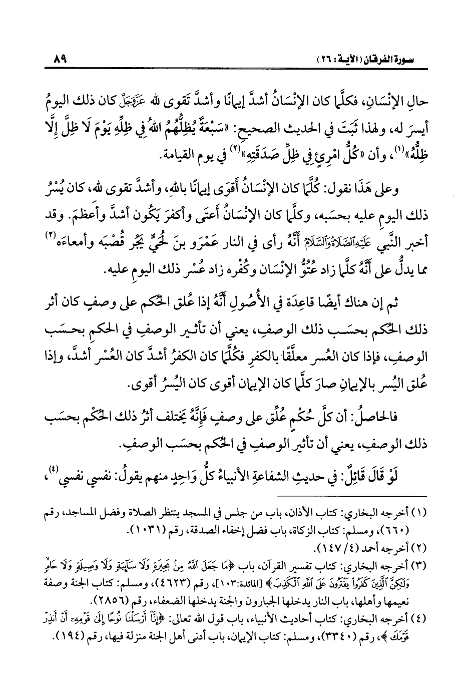ثم إن هناك أيضًا قاعِدَة في الأُصُولِ أَنَّهُ إذا عُلق الحُكم على وصفٍ كان أثر ذلك الحُكم بحسَب ذلك الوصفِ، يعني أن تأثير الوصفِ في الحكمِ بحسَب الوصفِ، فإذا كان العُسر معلَّقا بالكفرِ فكُلَّمَا كان الكفرُ أشدَّ كان العُسْر أشدَّ، وإذا عُلق اليُسر بالإيمانِ صارَ كلَّما كان الإيمان أقوى كان اليُسرُ أقوى.