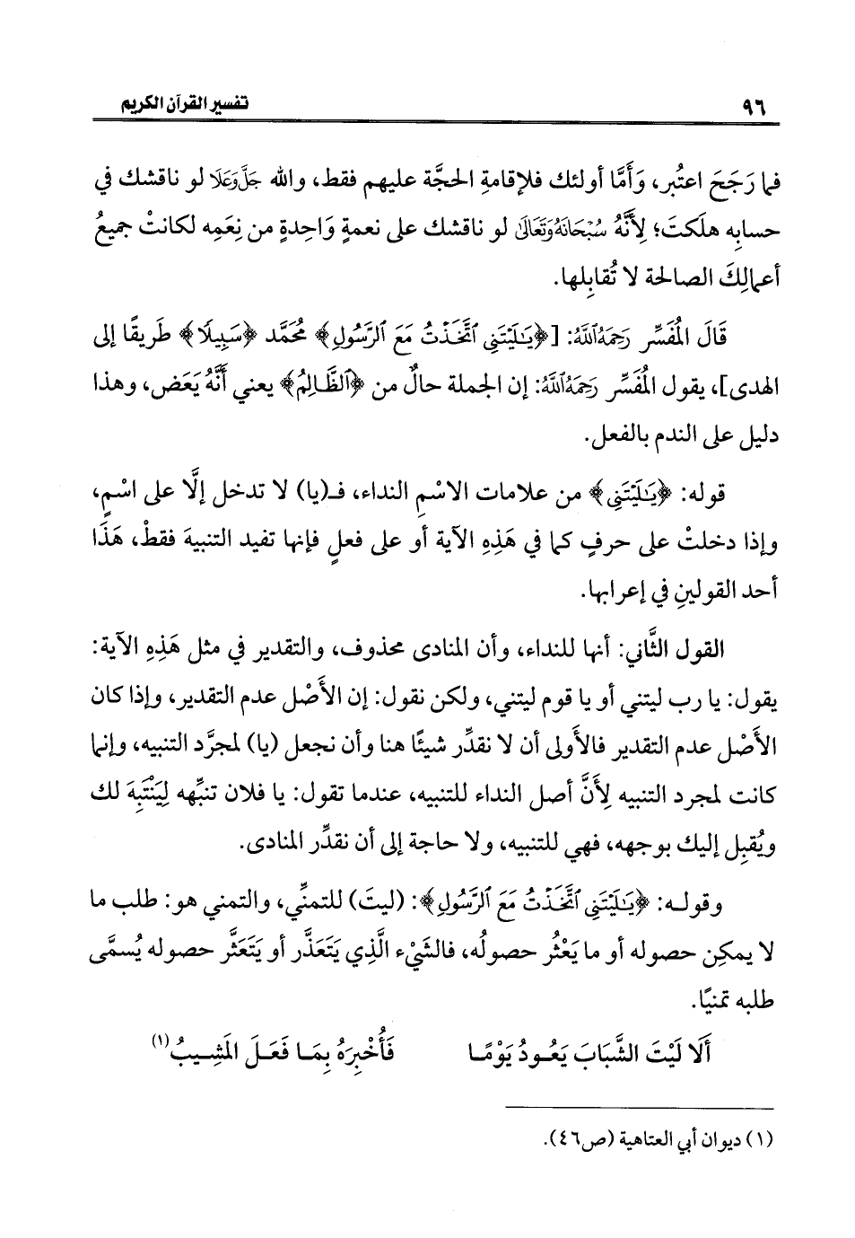 قَالَ المُفَسِّر رَحِمَهُ اللَّهُ: [{يَالَيْتَنِي اتَّخَذْتُ مَعَ الرَّسُولِ} مُحَمَّد {سَبِيلًا} طَريقًا إلى الهدى]، يقول المُفَسِّر رَحِمَهُ اللَّهُ: إن الجملة حالٌ من {الظَّالِمُ} يعني أنَّهُ يَعَض، وهذا دليل على الندم بالفعل.