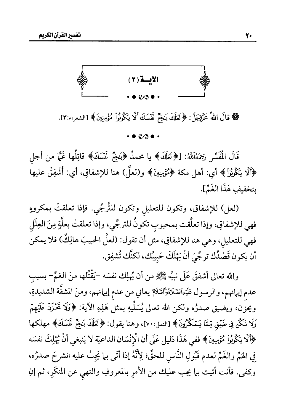 قَالَ المُفَسِّر رَحِمَهُ اللَّهُ: [{لَعَلَّكَ} يا محمدُ {بَاخِعٌ نَفْسَكَ} قاتِلُها غَمًّا من أجلِ {أَلَّا يَكُونُوا} أي: أهل مكة {مُؤْمِنِينَ} (ولعلَّ) هنا للإشفاقِ، أي: أَشْفِقْ عليها بتخفيفِ هَذَا الغَمِّ].