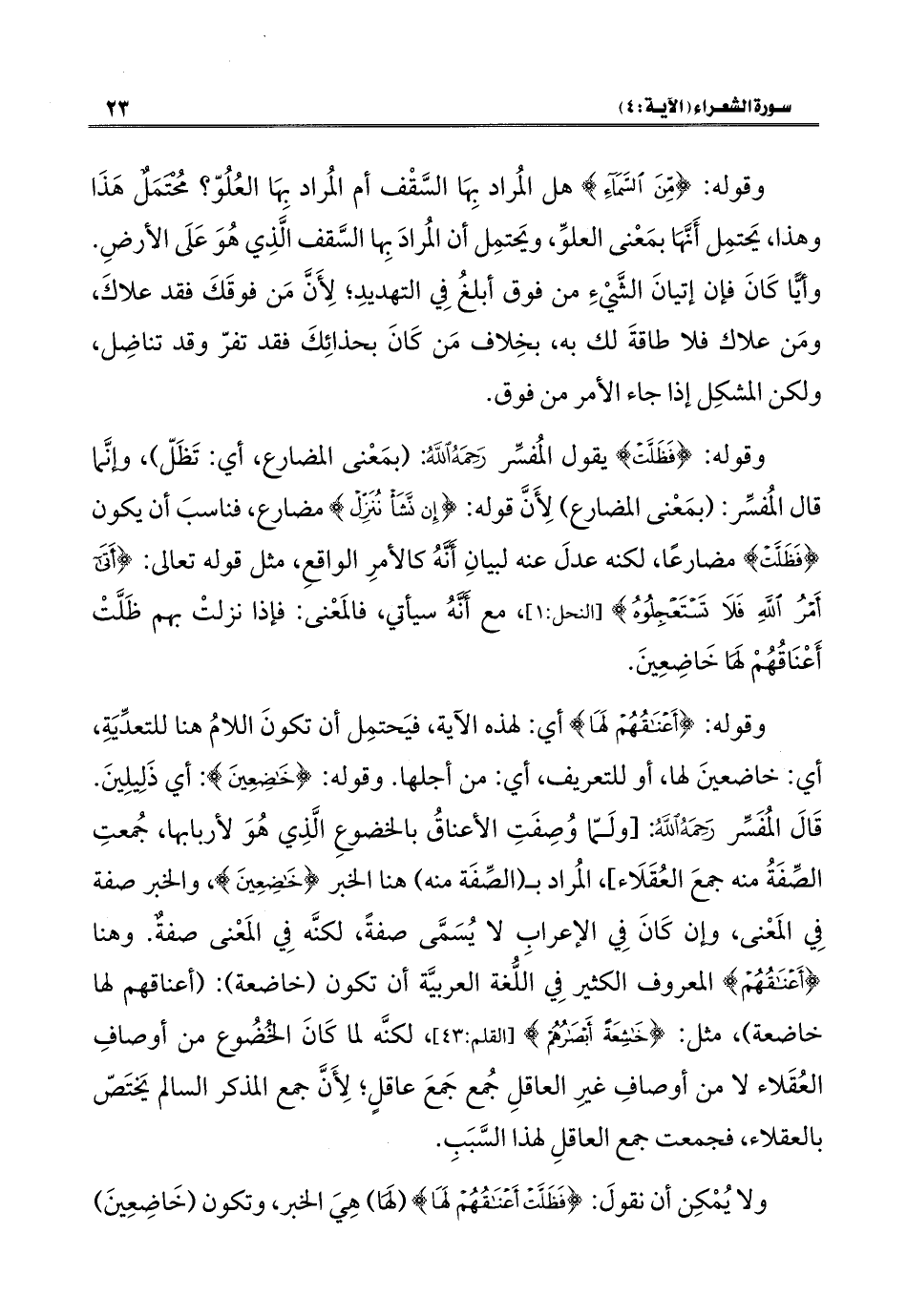 وقوله: {أَعْنَاقُهُمْ لَهَا} أي: لهذه الآية، فيَحتمِل أن تكونَ اللامُ هنا للتعدِّيَةِ، أي: خاضعينَ لها، أو للتعريف، أي: من أجلها. وقوله: {خَاضِعِينَ}: أي ذَلِيلِينَ. قَالَ المُفَسِّر رَحِمَهُ اللَّهُ: [ولَمّا وُصِفَتِ الأعناقُ بالخضوعِ الَّذِي هُوَ لأربابها، جُمعتِ الصِّفَةُ منه جمعَ العُقَلَاء]، المُراد بـ (الصِّفَة منه) هنا الخبر {خَاضِعِينَ}، والخبر صفة فِي المَعْنى، وإن كَانَ فِي الإعرابِ لا يُسَمَّى صفةً، لكنَّه فِي المَعْنى صفةٌ. وهنا {أَعْنَاقُهُمْ} المعروف الكثير فِي اللُّغة العربيَّة أن تكون (خاضعة): (أعناقهم لها خاضعة)، مثل: {خَاشِعَةً أَبْصَارُهُمْ} [القلم: ٤٣]، لكنَّه لما كَانَ الخُضُوع من أوصافِ العُقَلاء لا من أوصافِ غيرِ العاقلِ جُمع جَمعَ عاقلٍ؛ لِأَنَّ جمع المذكر السالم يَختَصّ بالعقلاء، فجمعت جمع العاقلِ لهذا السَّبَبِ.