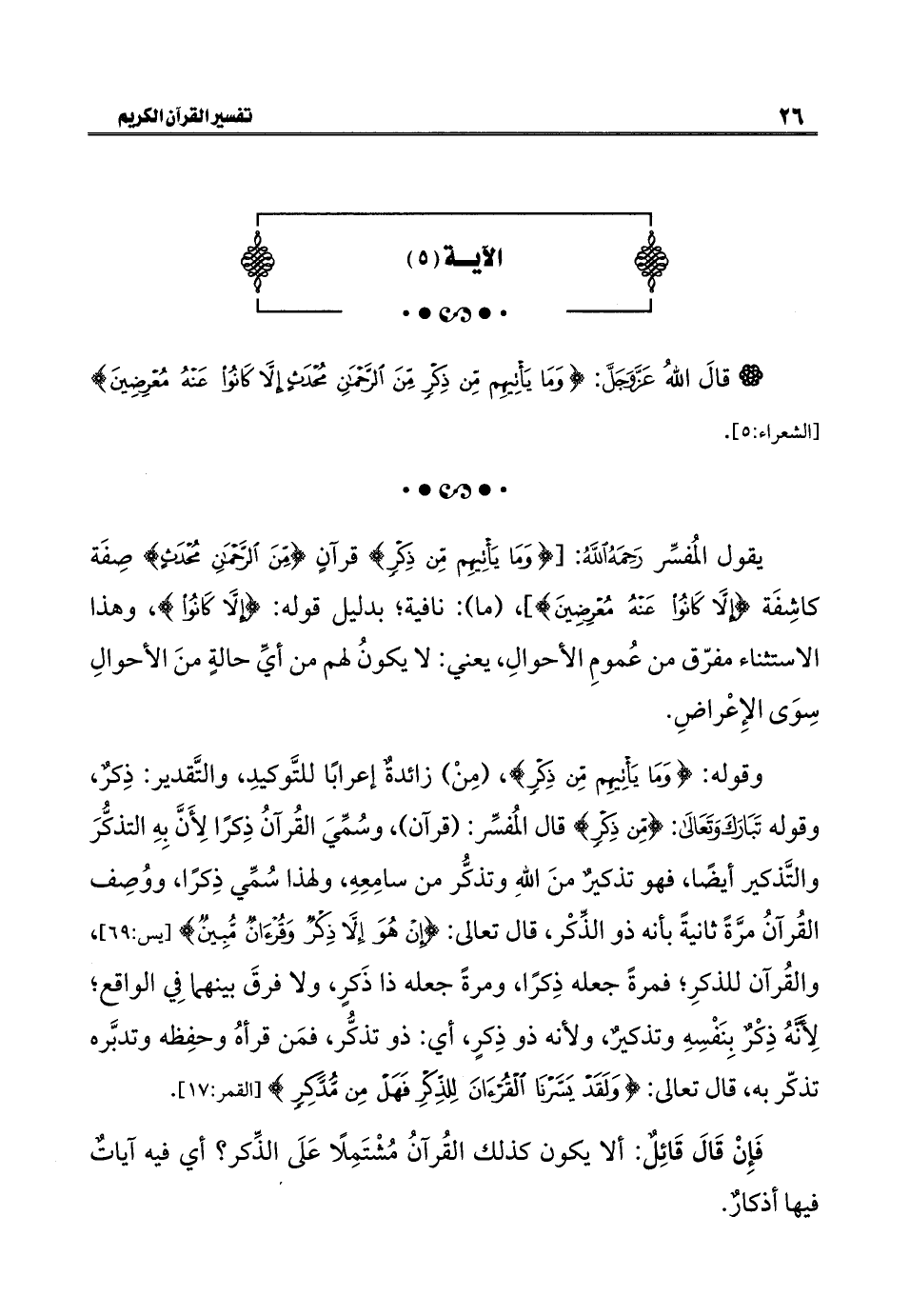 يقول المُفسِّر رَحِمَهُ اللَّهُ: [{وَمَا يَأْتِيهِمْ مِنْ ذِكْرٍ} قرآنٍ {مِنَ الرَّحْمَنِ مُحْدَثٍ} صِفَة كاشِفَة {إِلَّا كَانُوا عَنْهُ مُعْرِضِينَ}]، (ما): نافية؛ بدليل قوله: {إِلَّا كَانُوا}، وهذا الإستثناء مفرّق من عُمومِ الأحوالِ، يعني: لا يكونُ لهم من أيِّ حالةٍ منَ الأحوالِ سِوَى الإِعْراضِ.