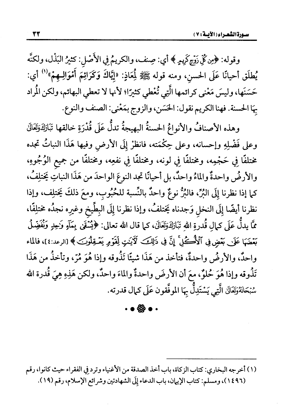 وقوله: {مِنْ كُلِّ زَوْجٍ كَرِيمٍ} أي: صِنف، والكريمُ فِي الأَصْلِ: كثيرُ البَذْل، ولكنَّه يُطلَق أحيانًا عَلَى الحسنِ، ومنه قوله - صلى الله عليه وسلم - لِمُعَاذٍ: "إِيَّاكَ وَكَرَائِمَ أَمْوَالِهِمْ" (¬١) أي: حَسَنَها، وليسَ مَعْنى كرائمها الَّتِي تُعْطي كثيرًا؛ لأنها لا تعطي البهائم، ولكن المُراد بِهَا الحسنة. فهنا الكريم نقول: الحَسَن، والزوج بمَعْنى: الصنف والنوع.