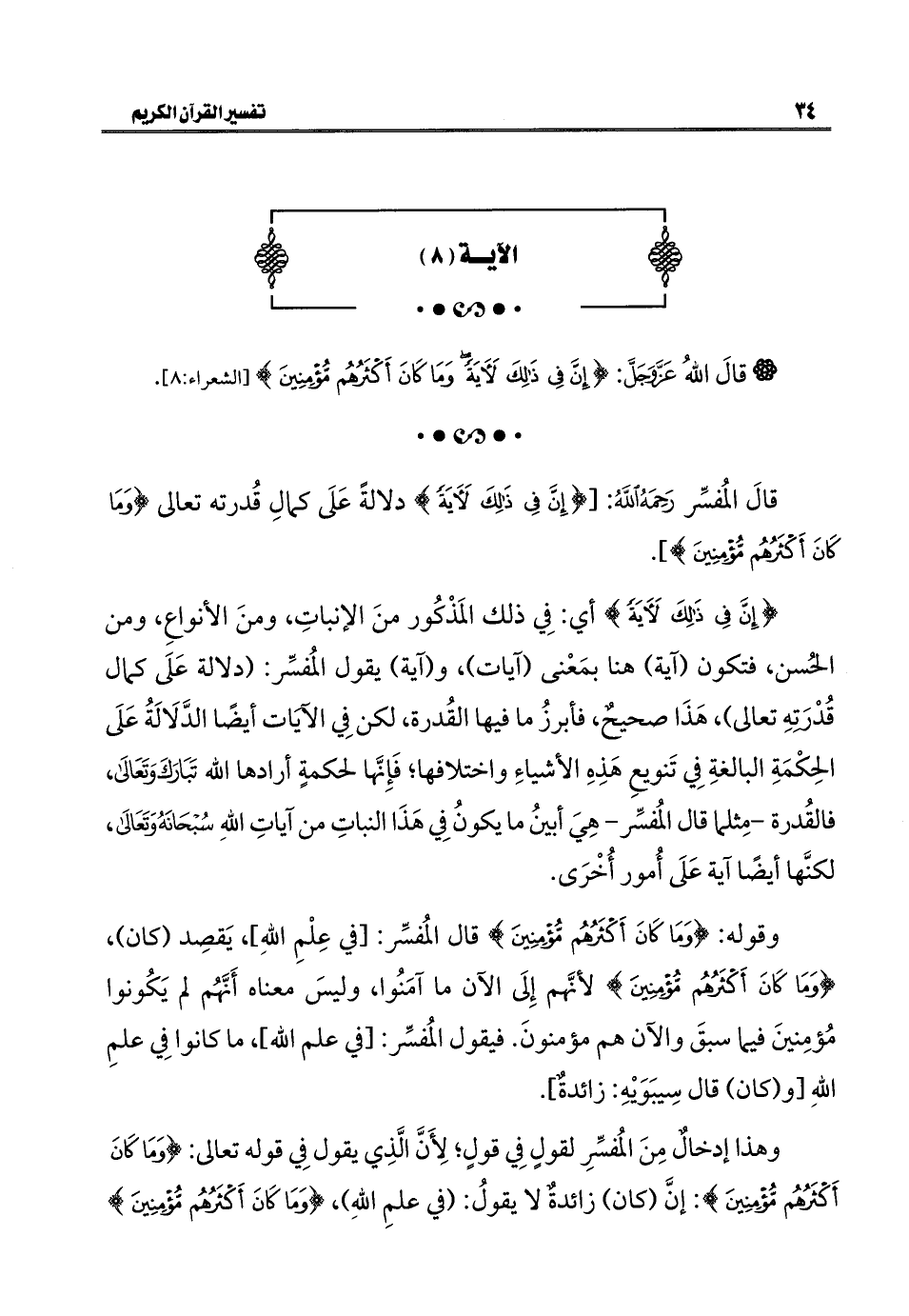 وقوله: {وَمَا كَانَ أَكْثَرُهُمْ مُؤْمِنِينَ} قال المُفسِّر: [في عِلْمِ الله]، يَقصِد (كان)، {وَمَا كَانَ أَكْثَرُهُمْ مُؤْمِنِينَ} لأنَّهم إِلَى الآن ما آمَنُوا، وليسَ معناه أَنَّهُم لم يَكُونوا مُؤمِنينَ فيما سبقَ والآن هم مؤمنونَ. فيقول المُفسِّر: [في علم الله]، ما كانوا فِي علمِ اللهِ [و (كان) قال سِيبَوَيْهِ: زائدةٌ].