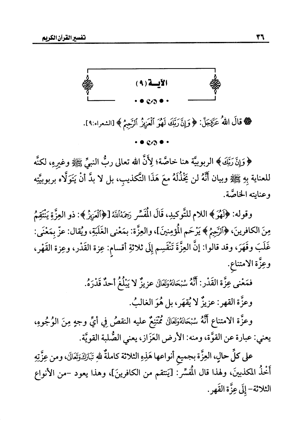 وقوله: {لَهُوَ} اللام للتَّوكيدِ، قَالَ المُفَسِّر رَحِمَهُ اللَّهُ [{الْعَزِيزُ}: ذو العِزَّةِ يَنْتَقِمُ مِنَ الكافرينَ، {الرَّحِيمُ} يَرْحَم المُؤمِنينَ]، والعِزَّة: بمَعْنى الغَلَبَةِ، ويُقال: عزّ بِمَعْنَى: غَلَبَ وقَهَرَ، وقد قالوا: إنَّ العِزَّةَ تَنْقَسِم إِلَى ثلاثةِ أقسامٍ: عِزة القَدْر، وعِزة القَهْر، وعِزَّة الإمتناعِ.