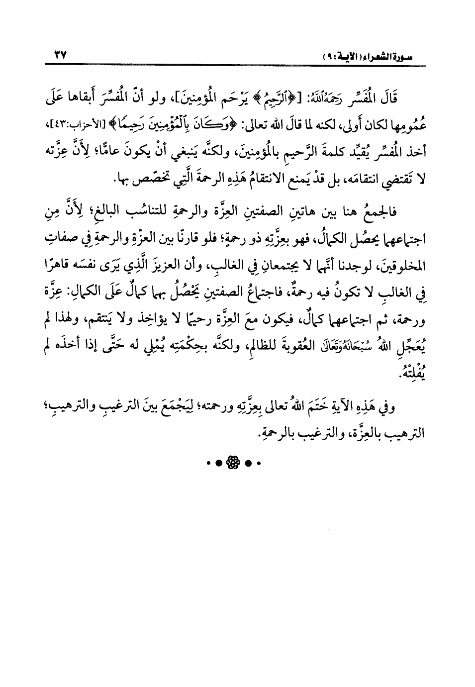 فالجمعُ هنا بين هاتينِ الصفتينِ العِزَّة والرحمةِ للتناسُب البالغِ؛ لِأَنَّ مِنِ اجتماعهما يحصُل الكمالُ، فهو بعِزَّتِهِ ذو رحمةٍ؛ فلو قارنّا بين العزّةِ والرحمةِ فِي صفاتِ المخلوقينَ، لوجدنا أنَّهما لا يجتمعانِ فِي الغالبِ، وأن العزيزَ الَّذِي يَرَى نفسَه قاهرًا فِي الغالبِ لا تكونُ فيه رحمةٌ، فاجتماعُ الصفتينِ يَحْصُلُ بهما كمالٌ عَلَى الكمالِ: عِزَّة ورحمة، ثم اجتماعهما كمالٌ، فيكون معَ العِزَّة رحيمًا لا يؤاخِذ ولا يَنتقم، ولهذا لم يُعَجِّلِ اللهُ سُبْحَانَهُ وَتَعَالَى العُقوبةَ للظالمِ، ولكنَّه بحِكْمَتِه يُمْلِي له حَتَّى إذا أخذَه لم يُفْلِتْهُ.