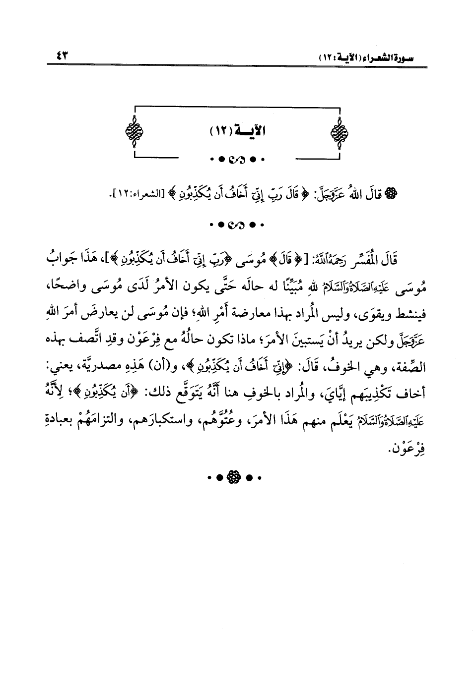 قَالَ المُفَسِّر رَحِمَهُ اللَّهُ: [{قَالَ} مُوسَى {رَبِّ إِنِّي أَخَافُ أَنْ يُكَذِّبُونِ}]، هَذَا جَوابُ مُوسَى عَلَيْهِ الصَّلَاةُ وَالسَّلَامُ للهِ مُبَيِّنًا له حالَه حَتَّى يكون الأمرُ لَدَى مُوسَى واضحًا، فينشط ويقوَى، وليس المُراد بهذا معارضة أَمْرِ اللهِ؛ فإن مُوسَى لن يعارضَ أمرَ اللهِ عَزَّ وَجَلَّ ولكن يريدُ أنْ يَستبينَ الأمرَ؛ ماذا تكون حالُهُ مع فِرْعَوْن وقدِ اتَّصف بهذه الصِّفة، وهي الخوفُ، قَالَ: {إِنِّي أَخَافُ أَنْ يُكَذِّبُونِ}، و (أن) هَذِهِ مصدريَّة، يعني: أخاف تَكْذِيبَهم إيَّايَ، والمُراد بالخوفِ هنا أَنَّهُ يَتَوَقَّع ذلك: {أَنْ يُكَذِّبُونِ}؛ لِأَنَّهُ عَلَيْهِ الصَّلَاةُ وَالسَّلَامُ يَعْلَم منهم هَذَا الأمرَ، وعُتُوَّهُم، واستكبارَهم، والتزامَهُمْ بعبادةِ فِرْعَوْن.