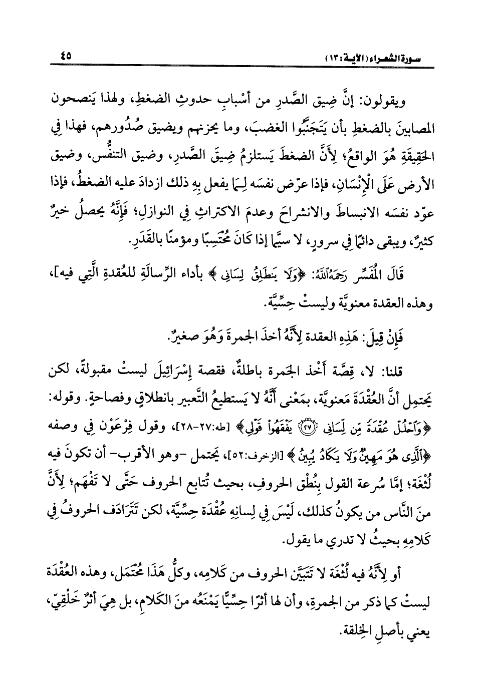 قلنا: لا، قِصَّة أَخْذ الجَمرة باطلةٌ، فقصة إِسْرَائِيلَ ليستْ مقبولةً، لكن يَحتمِل أنَّ العُقْدَةَ معنويَّة، بمَعْنى أَنَّهُ لا يَستطيعُ التَّعبير بانطلاقٍ وفصاحةٍ. وقوله: {وَاحْلُلْ عُقْدَةً مِنْ لِسَانِي (٢٧) يَفْقَهُوا قَوْلِي} [طه: ٢٧ - ٢٨]، وقول فِرْعَوْن فِي وصفه {الَّذِي هُوَ مَهِينٌ وَلَا يَكَادُ يُبِينُ} [الزخرف: ٥٢]، يَحتمل - وهو الأقرب - أن تكونَ فيه لُثْغَة؛ إمَّا سُرعة القول بِنُطْق الحروفِ، بحيث تُتابع الحروف حَتَّى لا تَفْهَم؛ لِأَنَّ منَ النَّاس من يكونُ كذلك، لَيْسَ فِي لِسانِهِ عُقْدَة حِسِّيَّة، لكن تَتَرَادَف الحروفُ فِي كَلامِهِ بحيثُ لا تدري ما يقول.
