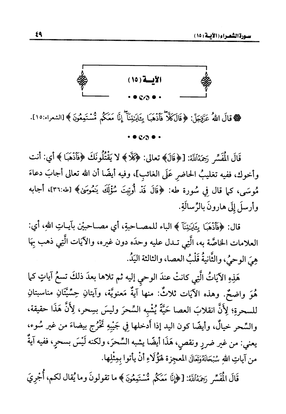 قَالَ المُفَسِّر رَحِمَهُ اللَّهُ: [{قَالَ} تعالى: {كَلَّا} لا يَقْتُلُونَكَ {فَاذْهَبَا} أي: أنت وأخوك، ففيه تغليبُ الحاضرِ عَلَى الغائبِ]، وفيه أيضًا أن الله تعالى أجابَ دعاءَ مُوسَى، كما قال فِي سُورة طه: {قَالَ قَدْ أُوتِيتَ سُؤْلَكَ يَامُوسَى} [طه: ٣٦]، أجابه وأرسلَ إِلَى هارونَ بالرِّسالَةِ.