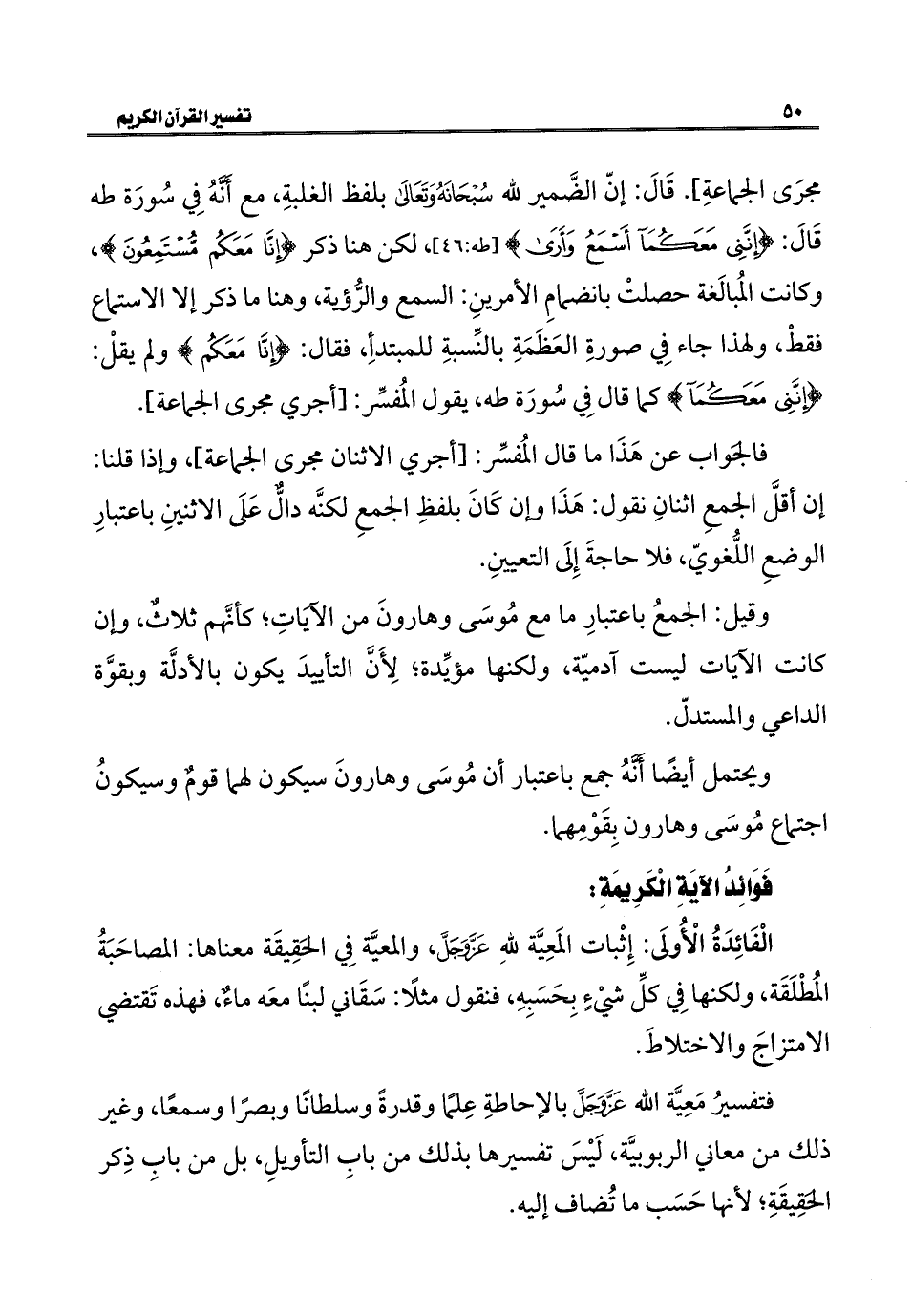الْفَائِدَةُ الْأُولَى: إِثْبات المَعِيَّة للهِ عَزَّ وَجَلَّ، والمعيَّة فِي الحَقِيقَة معناها: المصاحَبَةُ المُطْلَقَة، ولكنها فِي كلِّ شيْءٍ بِحَسَبِهِ، فنقول مثلًا: سَقَاني لبنًا معَه ماءٌ، فهذه تَقتضي الإمتزاج والإختلاطَ.