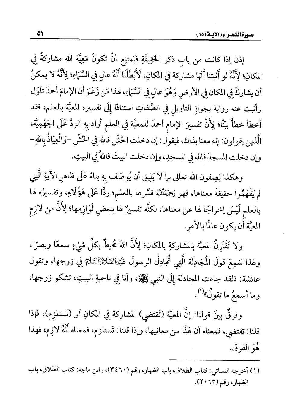 إذن إذا كانت من بابِ ذكر الحَقِيقَةِ فيَمتنِع أنْ تكونَ مَعِيَّة الله مشاركةً فِي المكانِ؛ لِأَنَّهُ لو أَثبتنا أَنَّهَا مشاركة فِي المكانِ، لَأَبْطَلْنَا أَنَّهُ عالٍ فِي السَّمَاءِ؛ لِأَنَّهُ لا يمكنُ أن يشاركَ فِي المكان فِي الأرضِ وَهُوَ عالٍ فِي السَّمَاءِ، لهذا مَن زَعَمَ أن الإمامَ أحمدَ تأوّل وأثبت عنه رواية بجوازِ التأويلِ فِي الصِّفاتِ استنادًا إِلَى تفسيره المعيَّة بالعلم، فقد أخطأ خطأً بيّنًا؛ لِأَنَّ تفسيرَ الإمامِ أحمدَ للمعيَّة فِي العلمِ أراد بِهِ الردَّ عَلَى الجَهْمِيَّة، الَّذين يقولون: إنه معنا بذاك، فيقول: إن دخلت الحُشّ فالله فِي الحُشّ - وَالْعِيَاذُ بِاللهِ - وإن دخلت المسجدَ فالله فِي المسجدِ، وإن دخلت البيتَ فاللهُ فِي البيتِ.