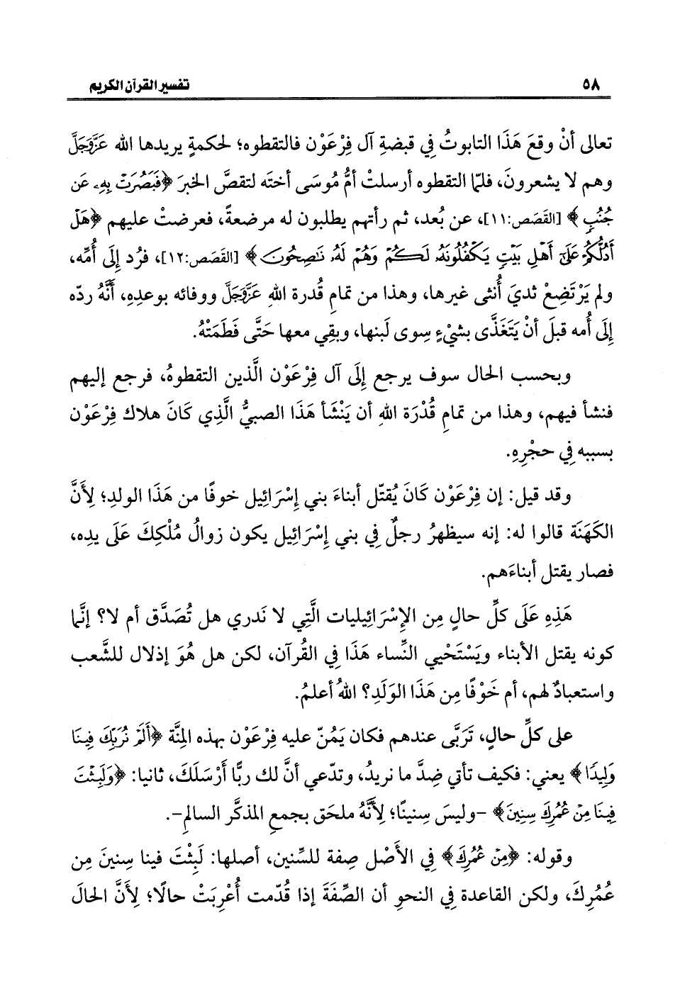 تعالى أنْ وقعَ هَذَا التابوتُ فِي قبضةِ آل فِرْعَوْن فالتقطوه؛ لحكمةٍ يريدها الله عَزَّ وَجَلَّ وهم لا يشعرونَ، فلمّا التقطوه أرسلتْ أمُّ مُوسَى أختَه لتقصَّ الخبرَ {فَبَصُرَتْ بِهِ عَنْ جُنُبٍ} [القصص: ١١]، عن بُعد، ثم رأتهم يطلبون له مرضعةً، فعرضتْ عليهم {هَلْ أَدُلُّكُمْ عَلَى أَهْلِ بَيْتٍ يَكْفُلُونَهُ لَكُمْ وَهُمْ لَهُ نَاصِحُونَ} [القصص: ١٢]، فرُد إِلَى أُمِّه، ولم يَرْتَضِعْ ثديَ أُنثى غيرها، وهذا من تمامِ قُدرة اللهِ عَزَّ وَجَلَّ ووفائه بوعدِهِ، أَنَّهُ ردّه إِلَى أُمه قبلَ أنْ يَتَغَذَّى بشيْءٍ سِوى لَبنها، وبقِي معها حَتَّى فَطَمَتْهُ.