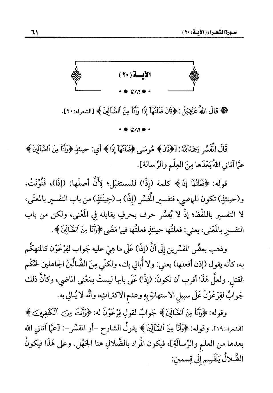 قَالَ المُفَسِّر رَحِمَهُ اللَّهُ: [{قَالَ} مُوسَى {فَعَلْتُهَا إِذًا} أي: حينئذٍ {وَأَنَا مِنَ الضَّالِّينَ} عمَّا آتاني اللهُ بَعْدَها مِنَ العِلْم والرِّسالة].