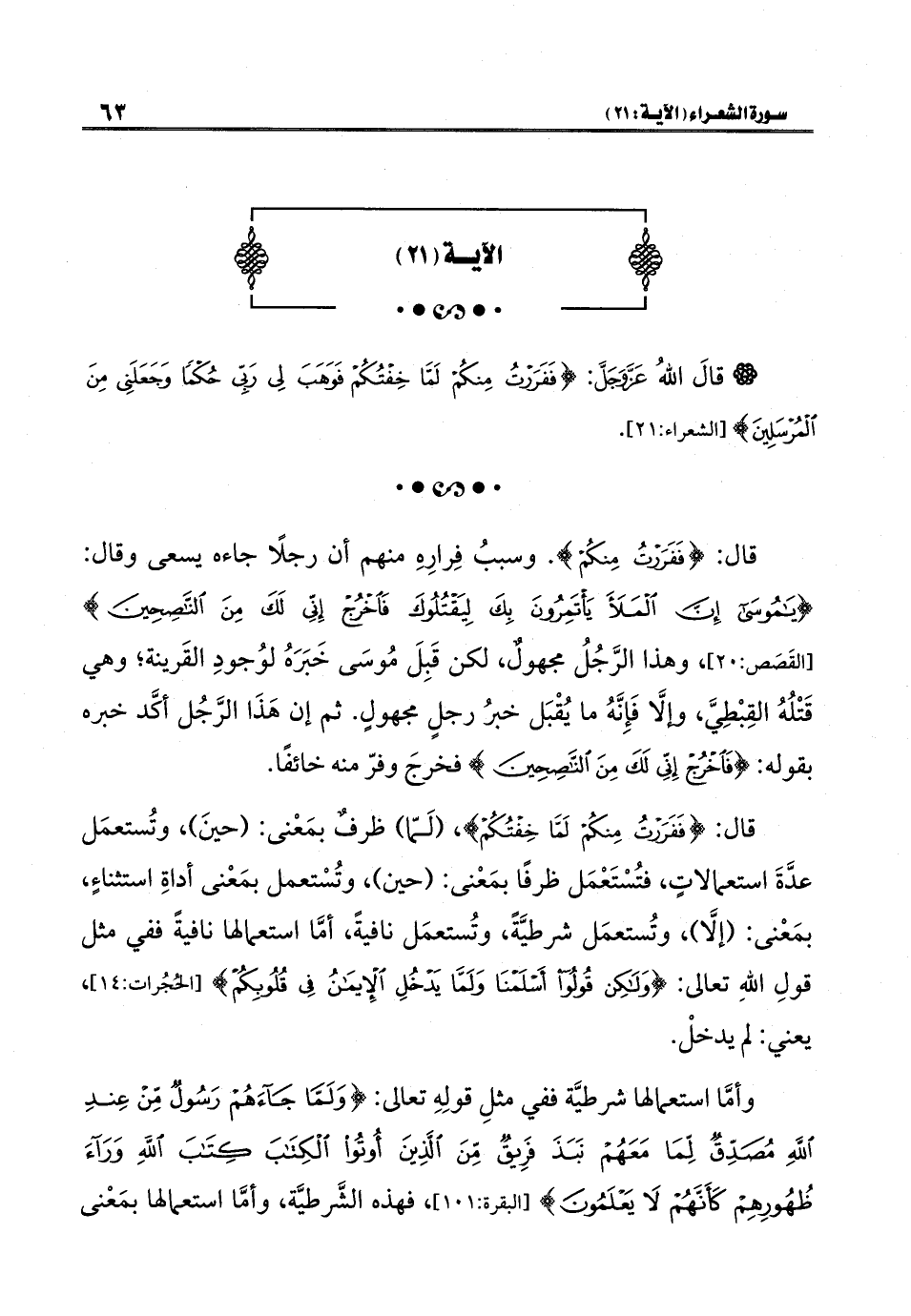 قال: {فَفَرَرْتُ مِنْكُمْ لَمَّا خِفْتُكُمْ}، (لَمّا) ظرفٌ بمَعْنى: (حينَ)، وتُستعمَل عدَّةَ استعمالاتٍ، فتُسْتَعْمَل ظرفًا بمَعْنى: (حين)، وتُسْتعمل بمَعْنى أداةِ استثناءٍ، بمَعْنى: (إلَّا)، وتُستعمَل شرطيَّةً، وتُستعمَل نافيةً، أمَّا استعمالها نافيةً ففي مثل قولِ اللهِ تعالى: {وَلَكِنْ قُولُوا أَسْلَمْنَا وَلَمَّا يَدْخُلِ الْإِيمَانُ فِي قُلُوبِكُمْ} [الحجرات: ١٤]، يعني: لم يدخلْ.