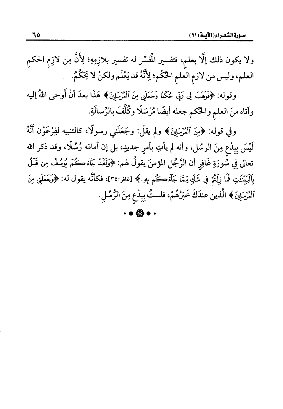 وفي قوله: {مِنَ الْمُرْسَلِينَ} ولم يقلْ: وجَعَلَني رسولًا، كالتنبيه لفِرْعَوْن أَنَّهُ لَيْسَ بِبِدْعٍ مِنَ الرسُل، وأنه لم يأتِ بأمرٍ جديدٍ، بل إن أمامَه رُسُلًا، وقد ذكر الله تعالى فِي سُورَةِ غَافِرٍ أن الرَّجُل المؤمنَ يقولُ لهم: {وَلَقَدْ جَاءَكُمْ يُوسُفُ مِنْ قَبْلُ بِالْبَيِّنَاتِ فَمَا زِلْتُمْ فِي شَكٍّ مِمَّا جَاءَكُمْ بِهِ} [غافر: ٣٤]، فكأنَّه يقول له: {وَجَعَلَنِي مِنَ الْمُرْسَلِينَ} الَّذين عندَكَ خَبَرُهُمْ، فلستُ بِبِدْعٍ مِنَ الرُّسُلِ.