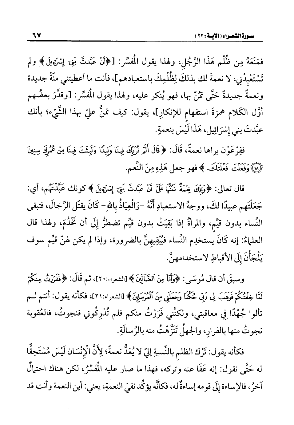 فمَنَعَهُ مِن ظُلْم هَذَا الرَّجُلِ، ولهذا يقول المُفسِّر: [{أَنْ عَبَّدْتَ بَنِي إِسْرَائِيلَ} ولم تَسْتَعْبِدْنِي، لا نعمةَ لك بذلكَ لِظُلْمِكَ باستعبادهم]، فأنت ما أعطيتني منّةً جديدة ونعمةً جديدةً حَتَّى تمُنّ بها، فهو يُنكر عليه، ولهذا يقول المُفسِّر: [وقدَّرَ بعضُهم أوَّل الكَلام همزةَ استفهامٍ للإنكارِ]، يقول: كيف تمنُّ عليّ بهذا الشَّيْء؛ بأنك عبَّدتَ بني إِسْرَائِيل، هَذَا لَيْسَ بنعمةٍ.