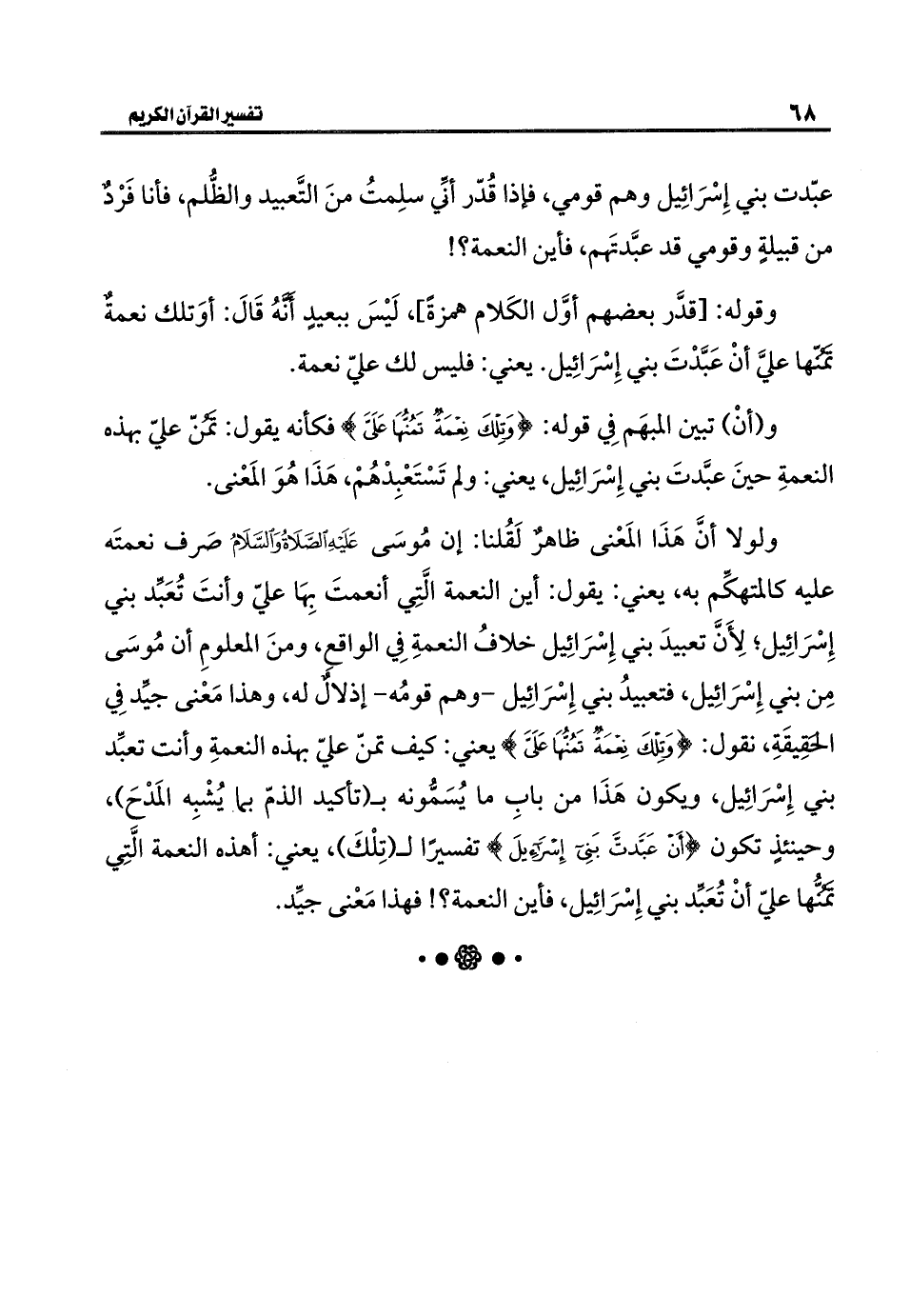 ولولا أنَّ هَذَا المَعْنى ظاهرٌ لَقُلنا: إن مُوسَى عَلَيْهِ الصَّلَاةُ وَالسَّلَامُ صَرف نعمتَه عليه كالمتهكِّم به، يعني: يقول: أين النعمة الَّتِي أنعمتَ بِهَا عليّ وأنتَ تُعَبِّد بني إِسْرَائِيل؛ لِأَنَّ تعبيدَ بني إِسْرَائِيل خلافُ النعمةِ فِي الواقعِ، ومنَ المعلومِ أن مُوسَى مِن بني إِسْرَائِيل، فتعبيدُ بني إِسْرَائِيل - وهم قومُه - إذلالٌ له، وهذا مَعْنى جيِّد فِي الحَقِيقَةِ، نقول: {وَتِلْكَ نِعْمَةٌ تَمُنُّهَا عَلَيَّ} يعني: كيف تمنّ عليّ بهذه النعمةِ وأنت تعبِّد بني إِسْرَائِيل، ويكون هَذَا من بابِ ما يُسَمُّونه بـ (تأكيد الذمّ بما يُشْبِه المَدْحَ)، وحينئذٍ تكون {أَنْ عَبَّدْتَ بَنِي إِسْرَائِيلَ} تفسيرًا لـ (تِلْكَ)، يعني: أهذه النعمة الَّتِي تَمُنُّها عليّ أنْ تُعَبِّد بني إِسْرَائِيل، فأين النعمة؟ ! فهذا مَعْنى جيِّد.