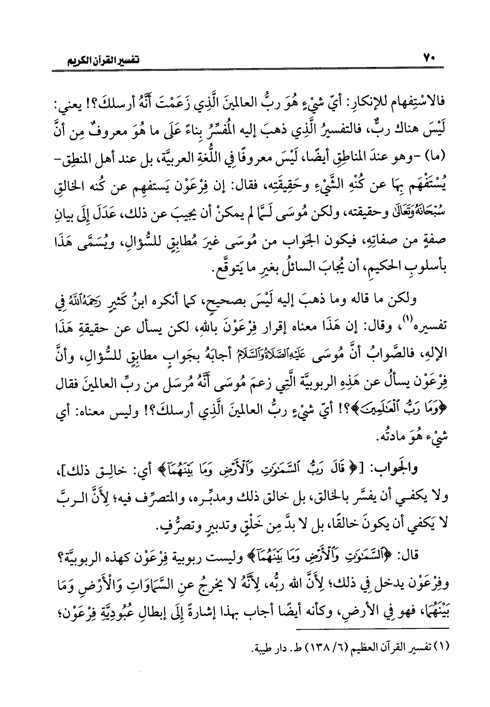 ولكن ما قاله وما ذهبَ إليه لَيْسَ بصحيحٍ، كما أنكره ابنُ كَثيرٍ رَحِمَهُ اللَّهُ فِي تفسيره (¬١)، وقال: إن هَذَا معناه إقرار فِرْعَوْنَ باللهِ، لكن يسأل عن حقيقةِ هَذَا الإلهِ، فالصَّوابُ أنَّ مُوسَى عَلَيْهِ الصَّلَاةُ وَالسَّلَامُ أجابَهُ بجَوابٍ مطابِقٍ للسُّؤالِ، وأنَّ فِرْعَوْن يسألُ عن هَذِهِ الربوبيَّة الَّتِي زعمَ مُوسَى أَنَّهُ مُرسَل من ربِّ العالمينَ فقال {وَمَا رَبُّ الْعَالَمِينَ}؟ ! أيّ شيْءٍ ربُّ العالمينَ الَّذِي أرسلكَ؟ ! وليس معناه: أي شيْء هُوَ مادتُه.