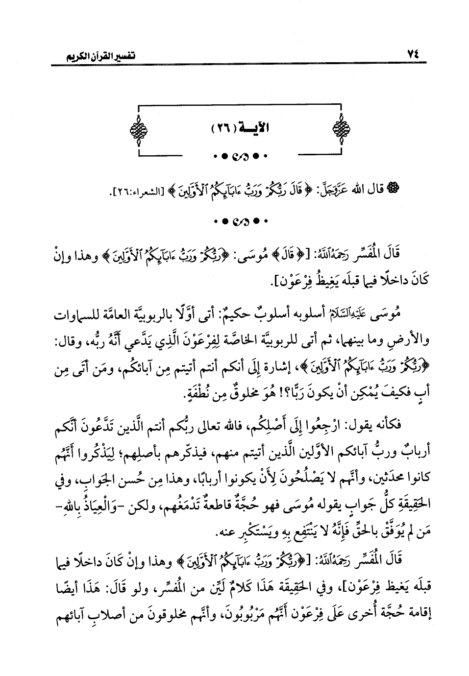 قَالَ المُفَسِّر رَحِمَهُ اللَّهُ: [{قَالَ} مُوسَى: {رَبُّكُمْ وَرَبُّ آبَائِكُمُ الْأَوَّلِينَ} وهذا وإنْ كَانَ داخلًا فيما قبلَه يَغِيظُ فِرْعَوْن].