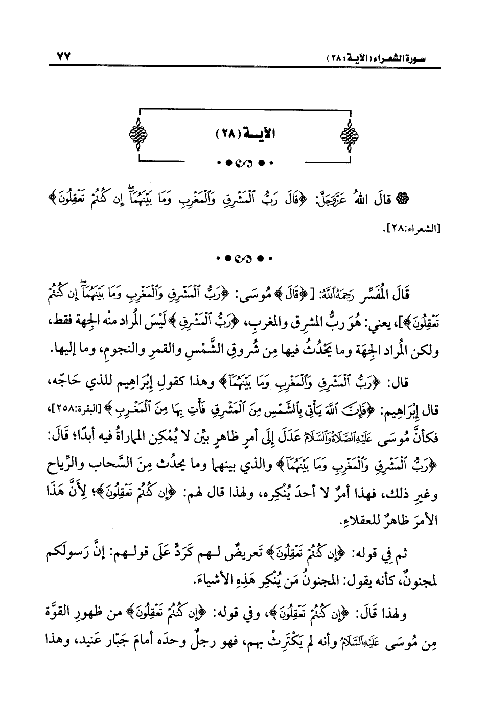 قَالَ المُفَسِّر رَحِمَهُ اللَّهُ: [{قَالَ} مُوسَى: {رَبُّ الْمَشْرِقِ وَالْمَغْرِبِ وَمَا بَيْنَهُمَا إِنْ كُنْتُمْ تَعْقِلُونَ}]، يعني: هُوَ ربُّ المشرِق والمغربِ، {رَبُّ الْمَشْرِقِ} لَيْسَ المُراد منْه الجِهة فقط، ولكن المُراد الجِهَة وما يَحْدُثُ فيها مِن شُروقِ الشَّمْسِ والقمرِ والنجومِ، وما إليها.